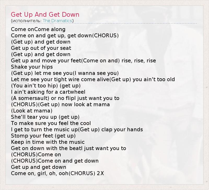 Come onCome along Come on and get up, get down(CHORUS) (Get up) and get down Get up out of your seat (Get up) and get down Get up and move your feet(Come on and) rise, rise, rise Shake your hips (Get up) let me see you(I wanna see you) Let me see your tight wire come alive(Get up) you ain't too old (You ain't too hip) (get up) I ain't asking for a cartwheel (A somersault) or no flipI just want you to (CHORUS)(Get up) now look at mama (Look at mama) She'll tear you up (get up) To make sure you feel the cool I get to turn the music up(Get up) clap your hands Stomp your feet (get up) Keep in time with the music Get on down with the beatI just want you to (CHORUS)Come on (CHORUS)Come on and get down Get up and get down Come on, girl, oh, ooh(CHORUS) 2X