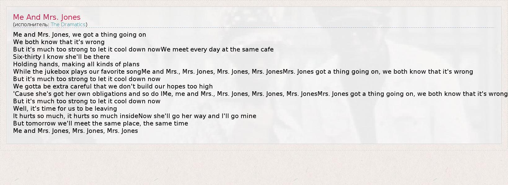 While the jukebox plays our favorite songMe and Mrs., Mrs. Jones, Mrs. Jones, Mrs. JonesMrs. Jones got a thing going on, we both know that it's wrong