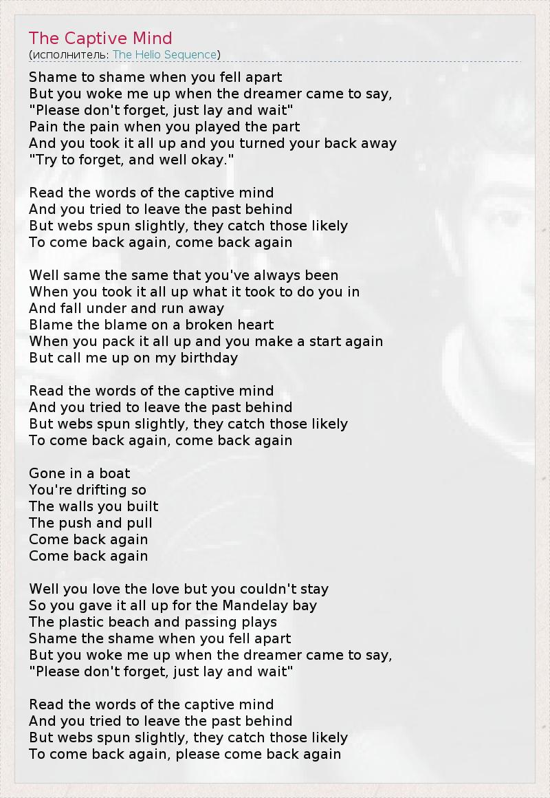 Shame to shame when you fell apart But you woke me up when the dreamer came to say, "Please don't forget, just lay and wait" Pain the pain when you played the part And you took it all up and you turned your back away "Try to forget, and well okay." Read the words of the captive mind And you tried to leave the past behind But webs spun slightly, they catch those likely To come back again, come back again Well same the same that you've always been When you took it all up what it took to do you in And fall under and run away Blame the blame on a broken heart When you pack it all up and you make a start again But call me up on my birthday Read the words of the captive mind And you tried to leave the past behind But webs spun slightly, they catch those likely To come back again, come back again Gone in a boat You're drifting so The walls you built The push and pull Come back again Come back again Well you love the love but you couldn't stay So you gave it all up for the Mandelay bay The plastic beach and passing plays Shame the shame when you fell apart But you woke me up when the dreamer came to say, "Please don't forget, just lay and wait" Read the words of the captive mind And you tried to leave the past behind But webs spun slightly, they catch those likely To come back again, please come back again