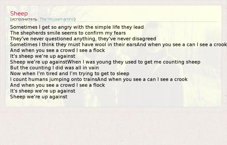 Sheep we're up againstWhen I was young they used to get me counting sheep