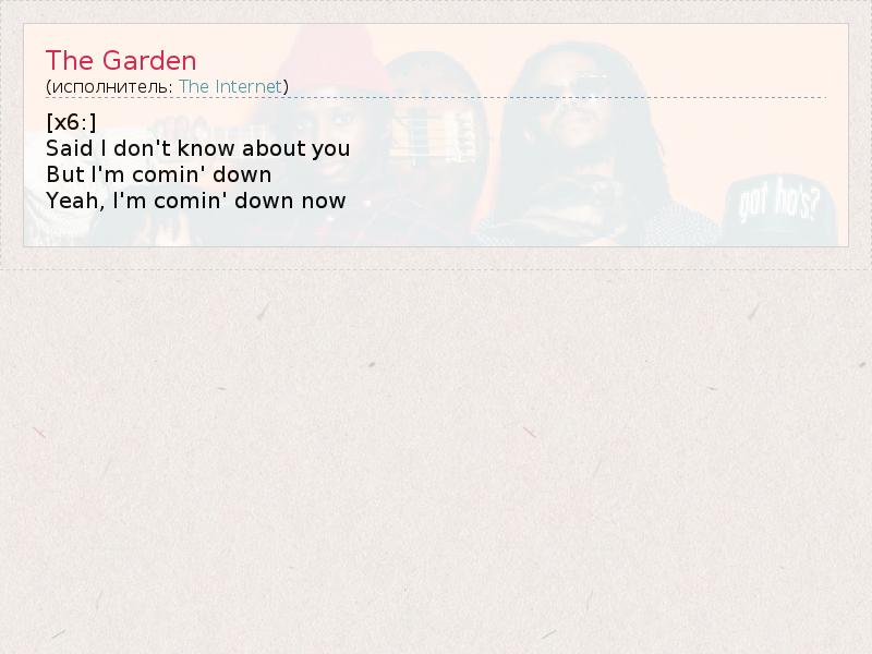 Это интересно:the Internet - электронный дуэт, состоящий из двух участников Лос-Анджелесской хип-хоп группировки Odd Future Wolf Gang Kill Them All (aka OFWGKTA) - Syd tha Kyd и Matt Martians. Мелодичный хип-хоп с женским соул вокалом.