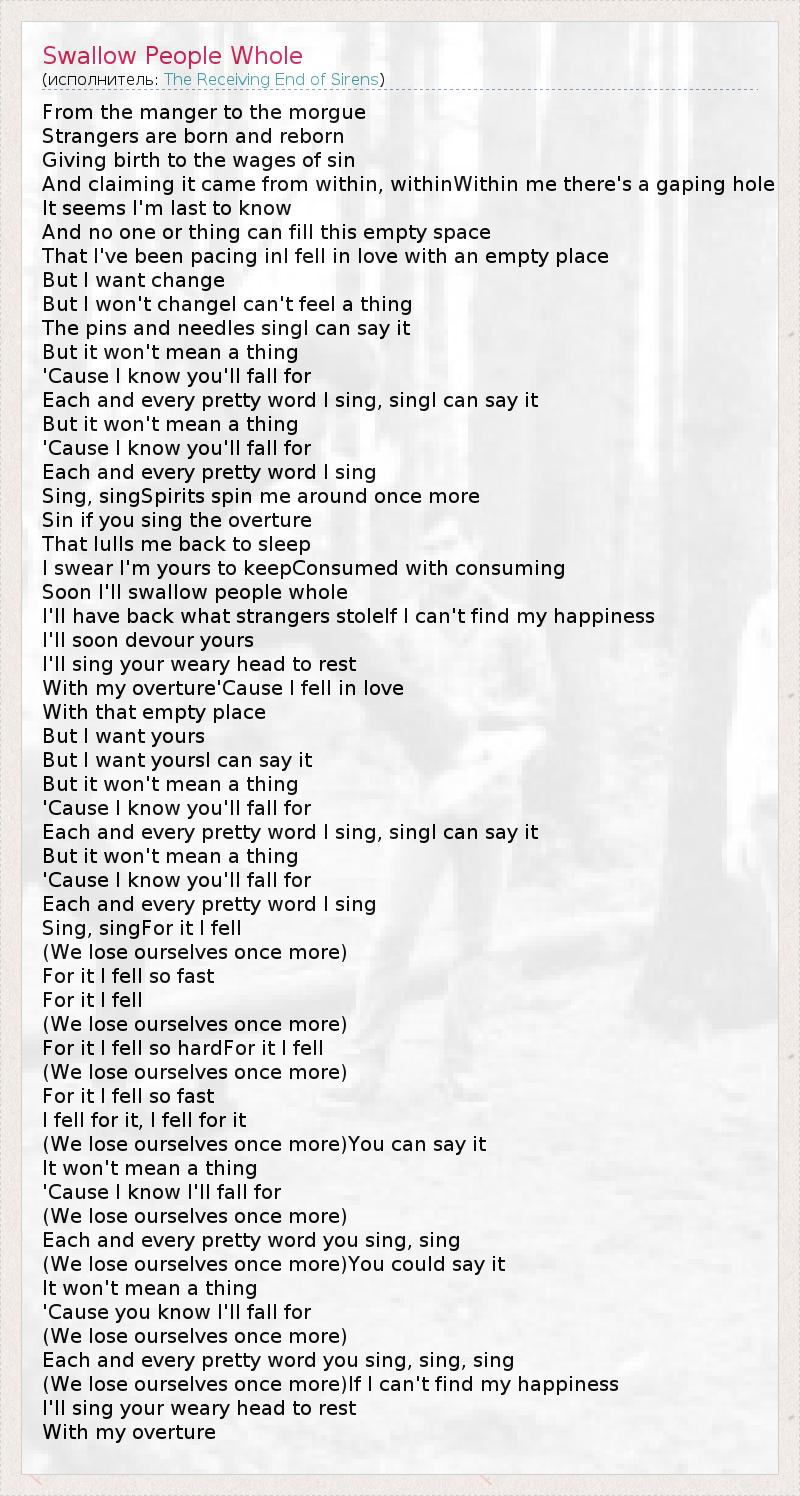 From the manger to the morgue Strangers are born and reborn Giving birth to the wages of sin And claiming it came from within, withinWithin me there's a gaping hole It seems I'm last to know And no one or thing can fill this empty space That I've been pacing inI fell in love with an empty place But I want change But I won't changeI can't feel a thing The pins and needles singI can say it But it won't mean a thing 'Cause I know you'll fall for Each and every pretty word I sing, singI can say it But it won't mean a thing 'Cause I know you'll fall for Each and every pretty word I sing Sing, singSpirits spin me around once more Sin if you sing the overture That lulls me back to sleep I swear I'm yours to keepConsumed with consuming Soon I'll swallow people whole I'll have back what strangers stoleIf I can't find my happiness I'll soon devour yours I'll sing your weary head to rest With my overture'Cause I fell in love With that empty place But I want yours But I want yoursI can say it But it won't mean a thing 'Cause I know you'll fall for Each and every pretty word I sing, singI can say it But it won't mean a thing 'Cause I know you'll fall for Each and every pretty word I sing Sing, singFor it I fell (We lose ourselves once more) For it I fell so fast For it I fell (We lose ourselves once more) For it I fell so hardFor it I fell (We lose ourselves once more) For it I fell so fast I fell for it, I fell for it (We lose ourselves once more)You can say it It won't mean a thing 'Cause I know I'll fall for (We lose ourselves once more) Each and every pretty word you sing, sing (We lose ourselves once more)You could say it It won't mean a thing 'Cause you know I'll fall for (We lose ourselves once more) Each and every pretty word you sing, sing, sing (We lose ourselves once more)If I can't find my happiness I'll sing your weary head to rest With my overture