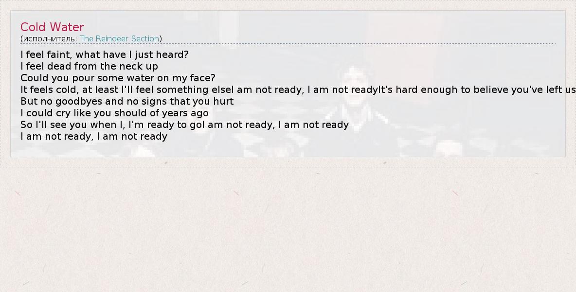 I feel faint, what have I just heard? I feel dead from the neck up Could you pour some water on my face? It feels cold, at least I'll feel something elseI am not ready, I am not readyIt's hard enough to believe you've left us But no goodbyes and no signs that you hurt I could cry like you should of years ago So I'll see you when I, I'm ready to goI am not ready, I am not ready I am not ready, I am not ready