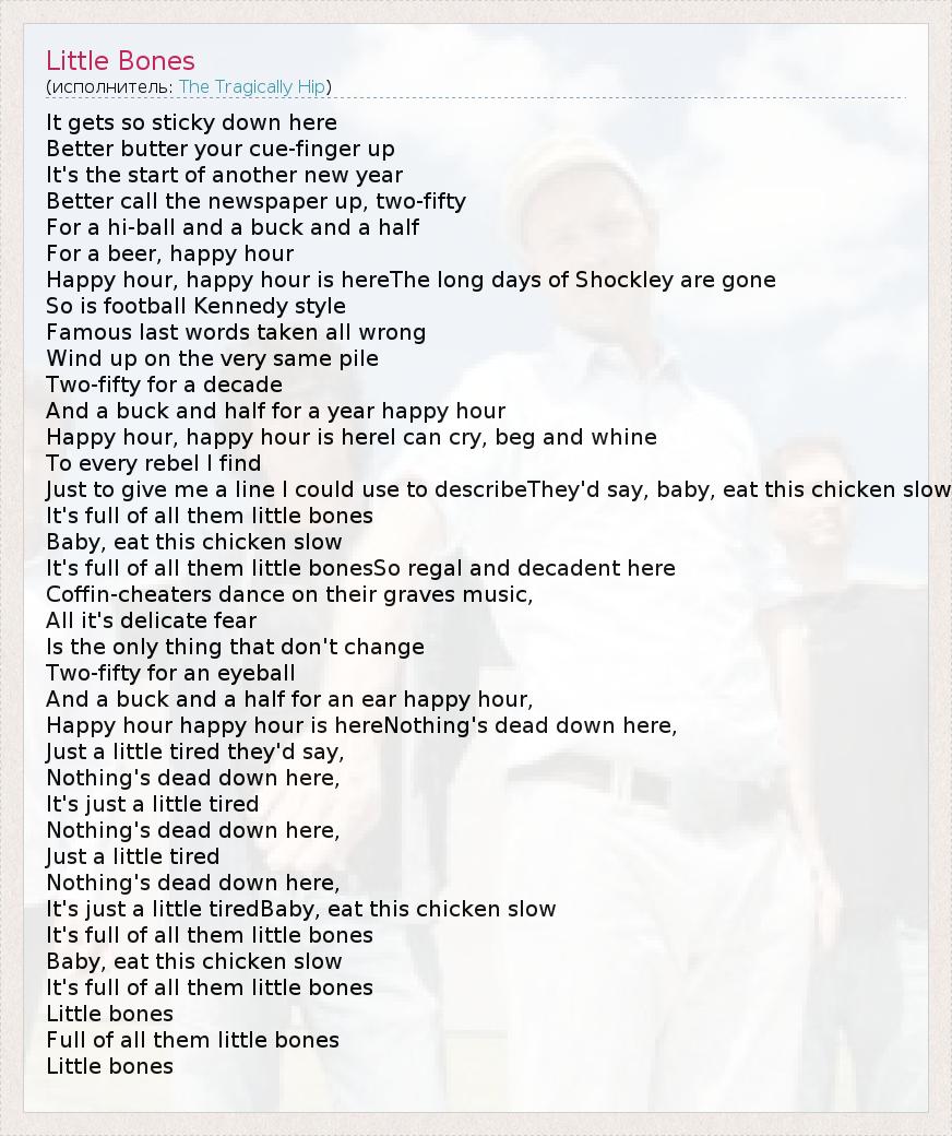 It gets so sticky down here Better butter your cue-finger up It's the start of another new year Better call the newspaper up, two-fifty For a hi-ball and a buck and a half For a beer, happy hour Happy hour, happy hour is hereThe long days of Shockley are gone So is football Kennedy style Famous last words taken all wrong Wind up on the very same pile Two-fifty for a decade And a buck and half for a year happy hour Happy hour, happy hour is hereI can cry, beg and whine To every rebel I find Just to give me a line I could use to describeThey'd say, baby, eat this chicken slow It's full of all them little bones Baby, eat this chicken slow It's full of all them little bonesSo regal and decadent here Coffin-cheaters dance on their graves music, All it's delicate fear Is the only thing that don't change Two-fifty for an eyeball And a buck and a half for an ear happy hour, Happy hour happy hour is hereNothing's dead down here, Just a little tired they'd say, Nothing's dead down here, It's just a little tired Nothing's dead down here, Just a little tired Nothing's dead down here, It's just a little tiredBaby, eat this chicken slow It's full of all them little bones Baby, eat this chicken slow It's full of all them little bones Little bones Full of all them little bones Little bones