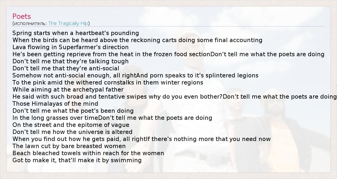 Spring starts when a heartbeat's pounding When the birds can be heard above the reckoning carts doing some final accounting Lava flowing in Superfarmer's direction He's been getting reprieve from the heat in the frozen food sectionDon't tell me what the poets are doing Don't tell me that they're talking tough Don't tell me that they're anti-social Somehow not anti-social enough, all rightAnd porn speaks to it's splintered legions To the pink amid the withered cornstalks in them winter regions While aiming at the archetypal father He said with such broad and tentative swipes why do you even bother?Don't tell me what the poets are doing Those Himalayas of the mind Don't tell me what the poet's been doing In the long grasses over timeDon't tell me what the poets are doing On the street and the epitome of vague Don't tell me how the universe is altered When you find out how he gets paid, all rightIf there's nothing more that you need now The lawn cut by bare breasted women Beach bleached towels within reach for the women Got to make it, that'll make it by swimming