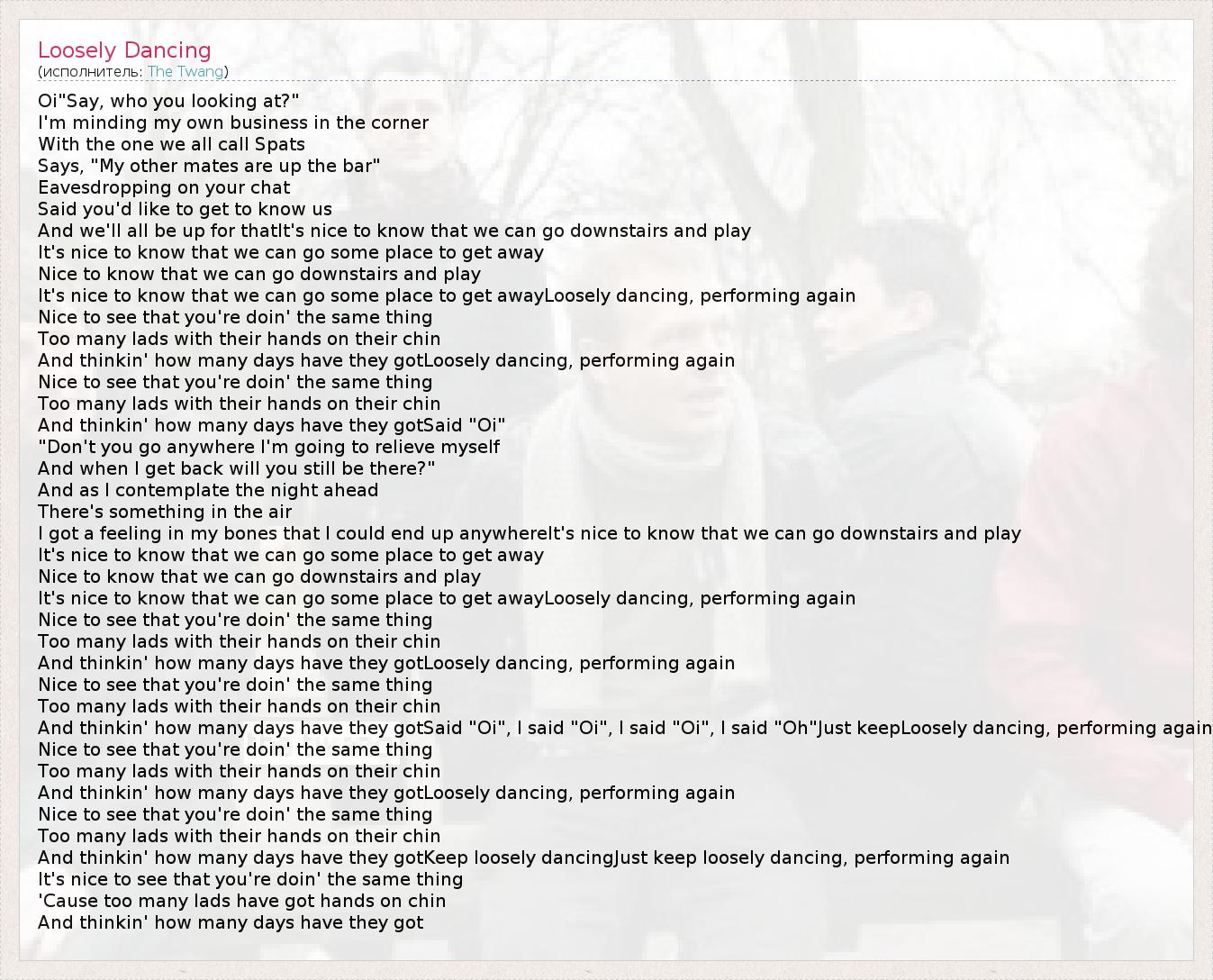 Oi"Say, who you looking at?" I'm minding my own business in the corner With the one we all call Spats Says, "My other mates are up the bar" Eavesdropping on your chat Said you'd like to get to know us And we'll all be up for thatIt's nice to know that we can go downstairs and play It's nice to know that we can go some place to get away Nice to know that we can go downstairs and play It's nice to know that we can go some place to get awayLoosely dancing, performing again Nice to see that you're doin' the same thing Too many lads with their hands on their chin And thinkin' how many days have they gotLoosely dancing, performing again Nice to see that you're doin' the same thing Too many lads with their hands on their chin And thinkin' how many days have they gotSaid "Oi" "Don't you go anywhere I'm going to relieve myself And when I get back will you still be there?" And as I contemplate the night ahead There's something in the air I got a feeling in my bones that I could end up anywhereIt's nice to know that we can go downstairs and play It's nice to know that we can go some place to get away Nice to know that we can go downstairs and play It's nice to know that we can go some place to get awayLoosely dancing, performing again Nice to see that you're doin' the same thing Too many lads with their hands on their chin And thinkin' how many days have they gotLoosely dancing, performing again Nice to see that you're doin' the same thing Too many lads with their hands on their chin And thinkin' how many days have they gotSaid "Oi", I said "Oi", I said "Oi", I said "Oh"Just keepLoosely dancing, performing again Nice to see that you're doin' the same thing Too many lads with their hands on their chin And thinkin' how many days have they gotLoosely dancing, performing again Nice to see that you're doin' the same thing Too many lads with their hands on their chin And thinkin' how many days have they gotKeep loosely dancingJust keep loosely dancing, performing again It's nice to see that you're doin' the same thing 'Cause too many lads have got hands on chin And thinkin' how many days have they got