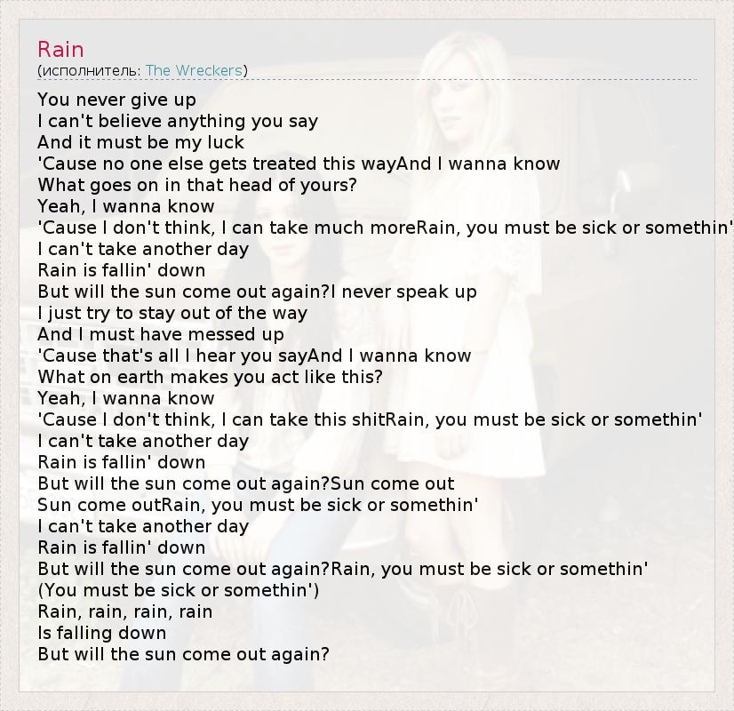 'Cause I don't think, I can take much moreRain, you must be sick or somethin'