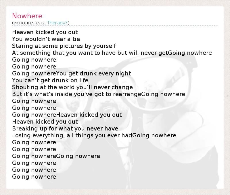Heaven kicked you out You wouldn't wear a tie Staring at some pictures by yourself At something that you want to have but will never getGoing nowhere Going nowhere Going nowhere Going nowhereYou get drunk every night You can't get drunk on life Shouting at the world you'll never change But it's what's inside you've got to rearrangeGoing nowhere Going nowhere Going nowhere Going nowhereHeaven kicked you out Heaven kicked you out Breaking up for what you never have Losing everything, all things you ever hadGoing nowhere Going nowhere Going nowhere Going nowhereGoing nowhere Going nowhere Going nowhere Going nowhere