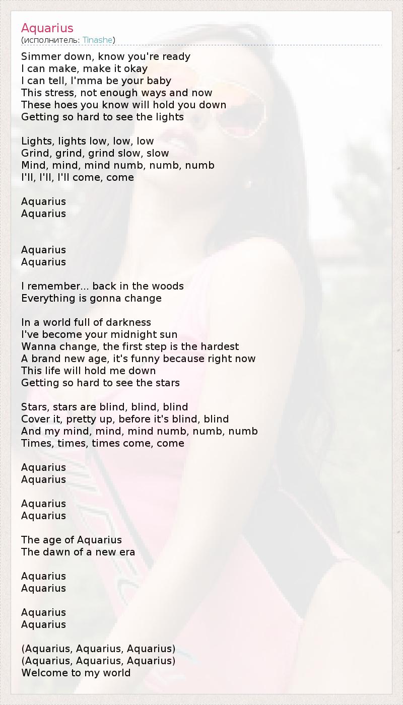 Simmer down, know you're ready I can make, make it okay I can tell, I'mma be your baby This stress, not enough ways and now These hoes you know will hold you down Getting so hard to see the lights Lights, lights low, low, low Grind, grind, grind slow, slow Mind, mind, mind numb, numb, numb I'll, I'll, I'll come, come Aquarius Aquarius Aquarius Aquarius I remember... back in the woods Everything is gonna change In a world full of darkness I've become your midnight sun Wanna change, the first step is the hardest A brand new age, it's funny because right now This life will hold me down Getting so hard to see the stars Stars, stars are blind, blind, blind Cover it, pretty up, before it's blind, blind And my mind, mind, mind numb, numb, numb Times, times, times come, come Aquarius Aquarius Aquarius Aquarius The age of Aquarius The dawn of a new era Aquarius Aquarius Aquarius Aquarius (Aquarius, Aquarius, Aquarius) (Aquarius, Aquarius, Aquarius) Welcome to my world
