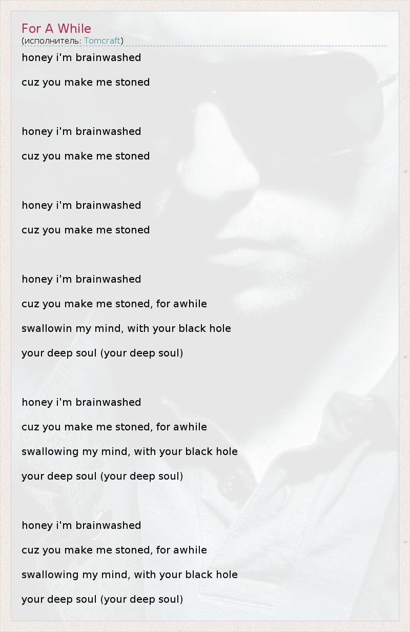 honey i'm brainwashed cuz you make me stoned honey i'm brainwashed cuz you make me stoned honey i'm brainwashed cuz you make me stoned honey i'm brainwashed cuz you make me stoned, for awhile swallowin my mind, with your black hole your deep soul (your deep soul) honey i'm brainwashed cuz you make me stoned, for awhile swallowing my mind, with your black hole your deep soul (your deep soul) honey i'm brainwashed cuz you make me stoned, for awhile swallowing my mind, with your black hole your deep soul (your deep soul)