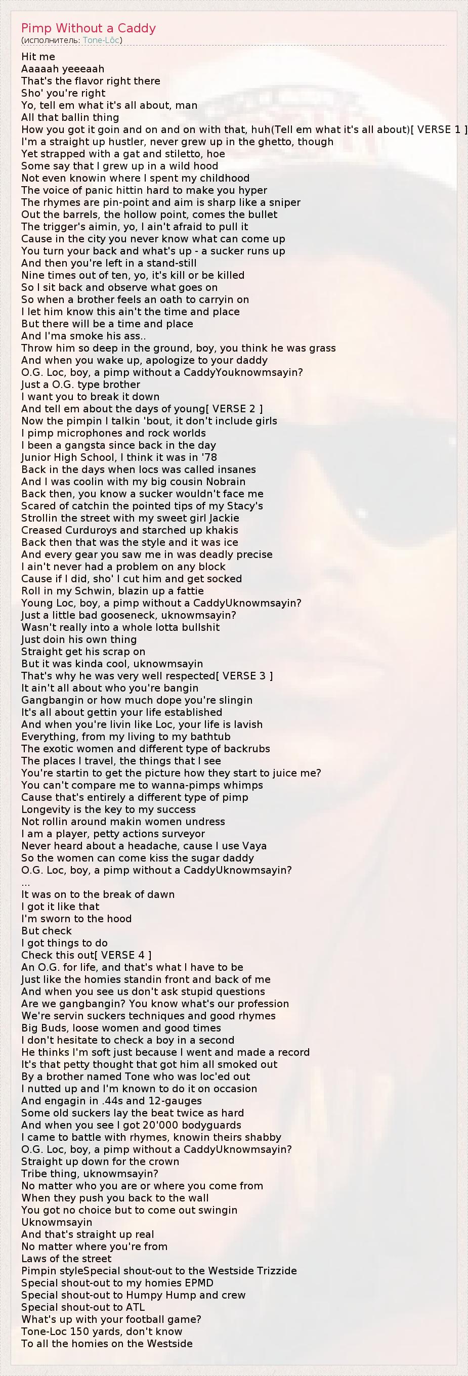 А как ты думаешь, о чем песня "Pimp Without a Caddy" ?