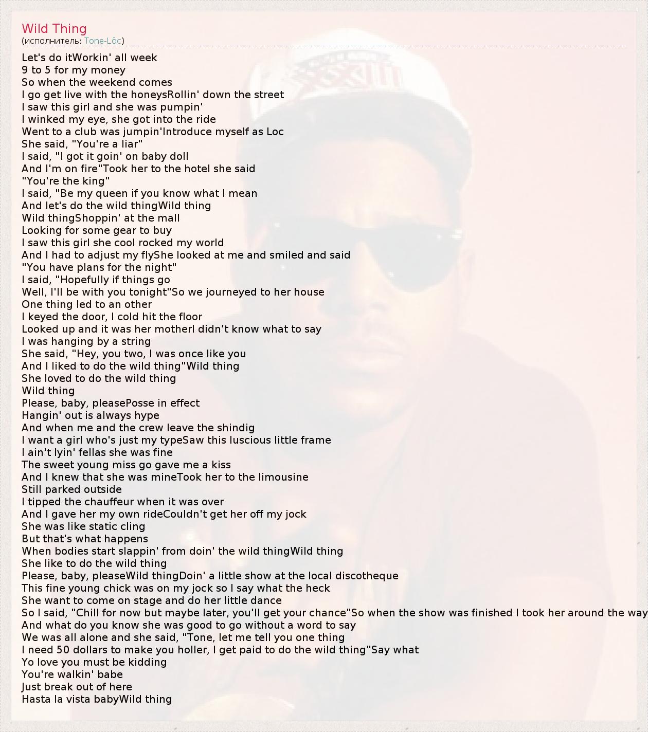 Let's do itWorkin' all week 9 to 5 for my money So when the weekend comes I go get live with the honeysRollin' down the street I saw this girl and she was pumpin' I winked my eye, she got into the ride Went to a club was jumpin'Introduce myself as Loc She said, "You're a liar" I said, "I got it goin' on baby doll And I'm on fire"Took her to the hotel she said "You're the king" I said, "Be my queen if you know what I mean And let's do the wild thingWild thing Wild thingShoppin' at the mall Looking for some gear to buy I saw this girl she cool rocked my world And I had to adjust my flyShe looked at me and smiled and said "You have plans for the night" I said, "Hopefully if things go Well, I'll be with you tonight"So we journeyed to her house One thing led to an other I keyed the door, I cold hit the floor Looked up and it was her motherI didn't know what to say I was hanging by a string She said, "Hey, you two, I was once like you And I liked to do the wild thing"Wild thing She loved to do the wild thing Wild thing Please, baby, pleasePosse in effect Hangin' out is always hype And when me and the crew leave the shindig I want a girl who's just my typeSaw this luscious little frame I ain't lyin' fellas she was fine The sweet young miss go gave me a kiss And I knew that she was mineTook her to the limousine Still parked outside I tipped the chauffeur when it was over And I gave her my own rideCouldn't get her off my jock She was like static cling But that's what happens When bodies start slappin' from doin' the wild thingWild thing She like to do the wild thing Please, baby, pleaseWild thingDoin' a little show at the local discotheque This fine young chick was on my jock so I say what the heck She want to come on stage and do her little dance So I said, "Chill for now but maybe later, you'll get your chance"So when the show was finished I took her around the way And what do you know she was good to go without a word to say We was all alone and she said, "Tone, let me tell you one thing I need 50 dollars to make you holler, I get paid to do the wild thing"Say what Yo love you must be kidding You're walkin' babe Just break out of here Hasta la vista babyWild thing