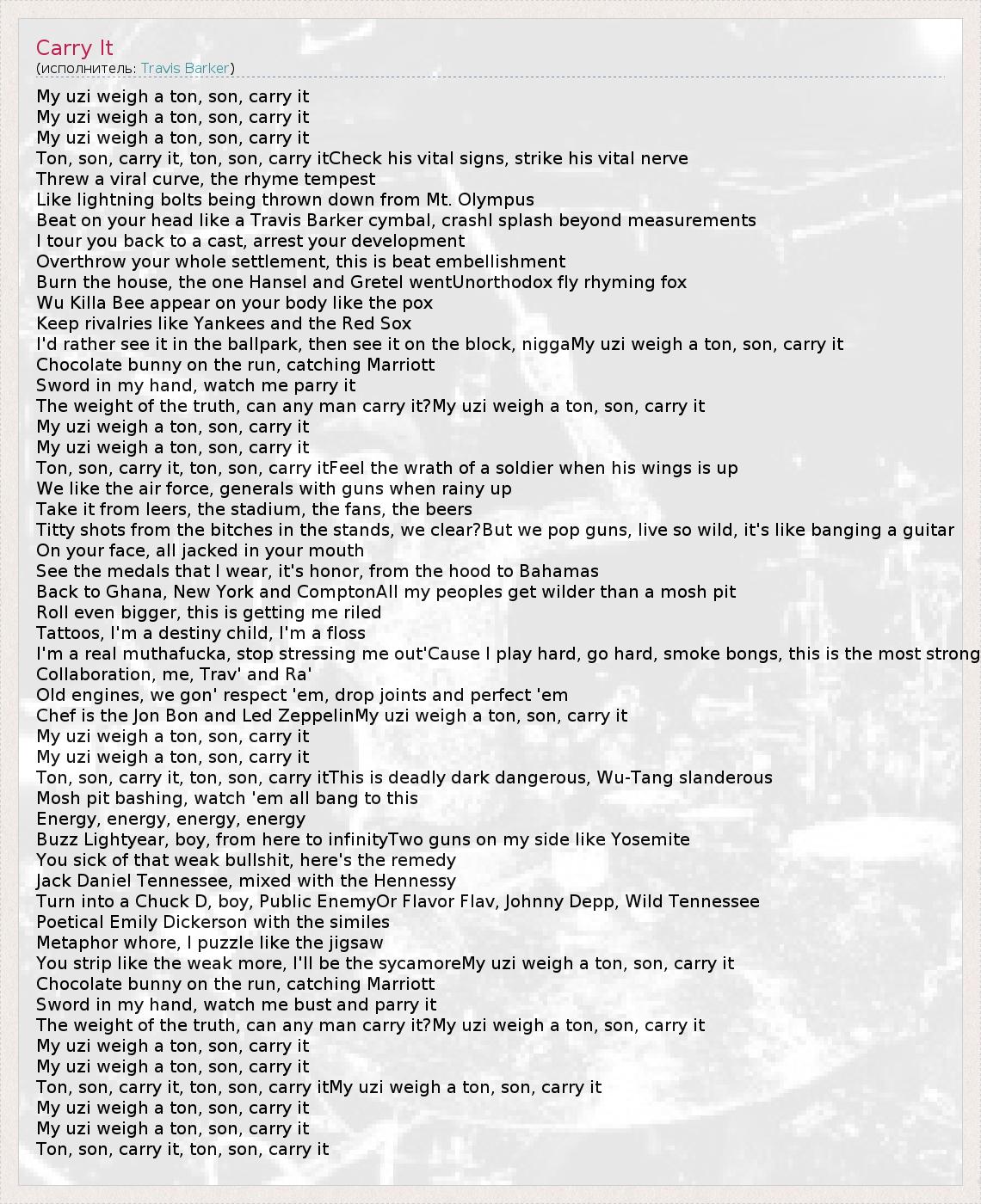 Ton, son, carry it, ton, son, carry itMy uzi weigh a ton, son, carry it