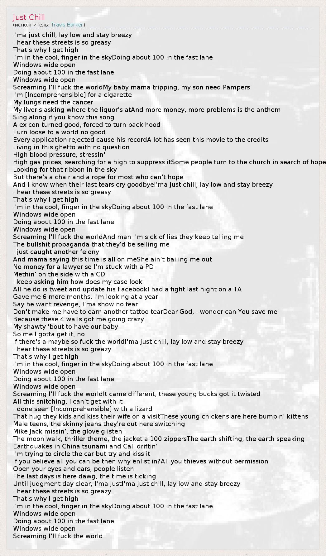 I'ma just chill, lay low and stay breezy I hear these streets is so greasy That's why I get high I'm in the cool, finger in the skyDoing about 100 in the fast lane Windows wide open Doing about 100 in the fast lane Windows wide open Screaming I'll fuck the worldMy baby mama tripping, my son need Pampers I'm [Incomprehensible] for a cigarette My lungs need the cancer My liver's asking where the liquor's atAnd more money, more problems is the anthem Sing along if you know this song A ex con turned good, forced to turn back hood Turn loose to a world no good Every application rejected cause his recordA lot has seen this movie to the credits Living in this ghetto with no question High blood pressure, stressin' High gas prices, searching for a high to suppress itSome people turn to the church in search of hope Looking for that ribbon in the sky But there's a chair and a rope for most who can't hope And I know when their last tears cry goodbyeI'ma just chill, lay low and stay breezy I hear these streets is so greasy That's why I get high I'm in the cool, finger in the skyDoing about 100 in the fast lane Windows wide open Doing about 100 in the fast lane Windows wide open Screaming I'll fuck the worldAnd man I'm sick of lies they keep telling me The bullshit propaganda that they'd be selling me I just caught another felony And mama saying this time is all on meShe ain't bailing me out No money for a lawyer so I'm stuck with a PD Methin' on the side with a CD I keep asking him how does my case look All he do is tweet and update his FacebookI had a fight last night on a TA Gave me 6 more months, I'm looking at a year Say he want revenge, I'ma show no fear Don't make me have to earn another tattoo tearDear God, I wonder can You save me Because these 4 walls got me going crazy My shawty 'bout to have our baby So me I gotta get it, no If there's a maybe so fuck the worldI'ma just chill, lay low and stay breezy I hear these streets is so greazy That's why I get high I'm in the cool, finger in the skyDoing about 100 in the fast lane Windows wide open Doing about 100 in the fast lane Windows wide open Screaming I'll fuck the worldIt came different, these young bucks got it twisted All this snitching, I can't get with it I done seen [Incomprehensible] with a lizard That hug they kids and kiss their wife on a visitThese young chickens are here bumpin' kittens Male teens, the skinny jeans they're out here switching Mike Jack missin', the glove glisten The moon walk, thriller theme, the jacket a 100 zippersThe earth shifting, the earth speaking Earthquakes in China tsunami and Cali driftin' I'm trying to circle the car but try and kiss it If you believe all you can be then why enlist in?All you thieves without permission Open your eyes and ears, people listen The last days is here dawg, the time is ticking Until judgment day clear, I'ma justI'ma just chill, lay low and stay breezy I hear these streets is so greazy That's why I get high I'm in the cool, finger in the skyDoing about 100 in the fast lane Windows wide open Doing about 100 in the fast lane Windows wide open Screaming I'll fuck the world
