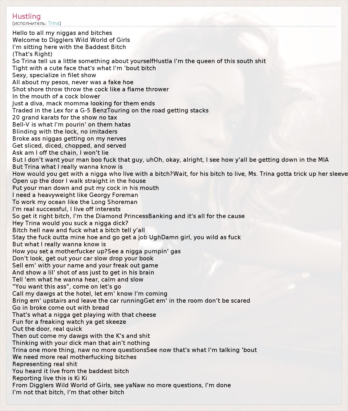 Это интересно:Катрина Лаверн Тэйлор, более известная под сценическим именем Трина, родилась 3 декабря 1978 г. в Майами, Флорида, США.Трина дебютировала с песней «Nann Nigga» в 1998 г. на музыкальном лейбле 'Slip-N-Slide' при поддержке Трика Дэдди. Ее первые два альбома, «золотой» по продажам дебют «Da Baddest Bitch», 2000 г., и последующий «Diamond Princess», 2002 г., получивший подобный статус. Альбомы были выполнены в так называемом... продолжение