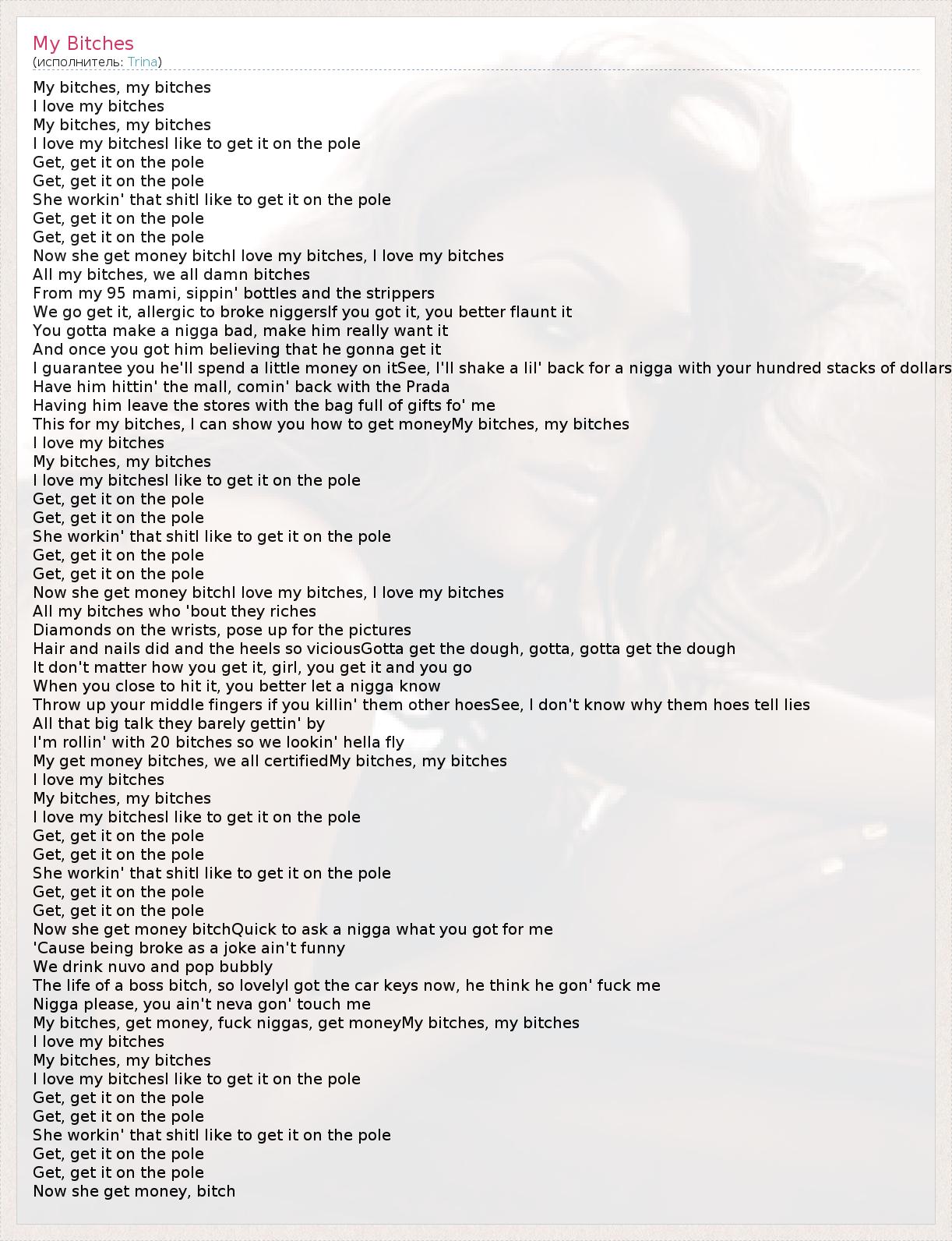 Это интересно:Катрина Лаверн Тэйлор, более известная под сценическим именем Трина, родилась 3 декабря 1978 г. в Майами, Флорида, США.Трина дебютировала с песней «Nann Nigga» в 1998 г. на музыкальном лейбле 'Slip-N-Slide' при поддержке Трика Дэдди. Ее первые два альбома, «золотой» по продажам дебют «Da Baddest Bitch», 2000 г., и последующий «Diamond Princess», 2002 г., получивший подобный статус. Альбомы были выполнены в так называемом... продолжение