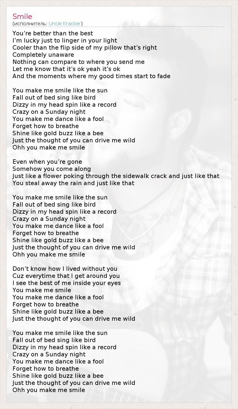 You’re better than the best I’m lucky just to linger in your light Cooler than the flip side of my pillow that’s right Completely unaware Nothing can compare to where you send me Let me know that it’s ok yeah it’s ok And the moments where my good times start to fade You make me smile like the sun Fall out of bed sing like bird Dizzy in my head spin like a record Crazy on a Sunday night You make me dance like a fool Forget how to breathe Shine like gold buzz like a bee Just the thought of you can drive me wild Ohh you make me smile Even when you’re gone Somehow you come along Just like a flower poking through the sidewalk crack and just like that You steal away the rain and just like that You make me smile like the sun Fall out of bed sing like bird Dizzy in my head spin like a record Crazy on a Sunday night You make me dance like a fool Forget how to breathe Shine like gold buzz like a bee Just the thought of you can drive me wild Ohh you make me smile Don’t know how I lived without you Cuz everytime that I get around you I see the best of me inside your eyes You make me smile You make me dance like a fool Forget how to breathe Shine like gold buzz like a bee Just the thought of you can drive me wild You make me smile like the sun Fall out of bed sing like bird Dizzy in my head spin like a record Crazy on a Sunday night You make me dance like a fool Forget how to breathe Shine like gold buzz like a bee Just the thought of you can drive me wild Ohh you make me smile