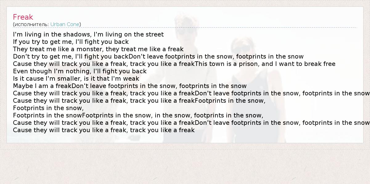I'm living in the shadows, I'm living on the street If you try to get me, I'll fight you back They treat me like a monster, they treat me like a freak Don't try to get me, I'll fight you backDon't leave footprints in the snow, footprints in the snow Cause they will track you like a freak, track you like a freakThis town is a prison, and I want to break free Even though I'm nothing, I'll fight you back Is it cause I'm smaller, is it that I'm weak Maybe I am a freakDon't leave footprints in the snow, footprints in the snow Cause they will track you like a freak, track you like a freakDon't leave footprints in the snow, footprints in the snow Cause they will track you like a freak, track you like a freakFootprints in the snow, Footprints in the snow, Footprints in the snowFootprints in the snow, in the snow, footprints in the snow, Cause they will track you like a freak, track you like a freakDon't leave footprints in the snow, footprints in the snow Cause they will track you like a freak, track you like a freak