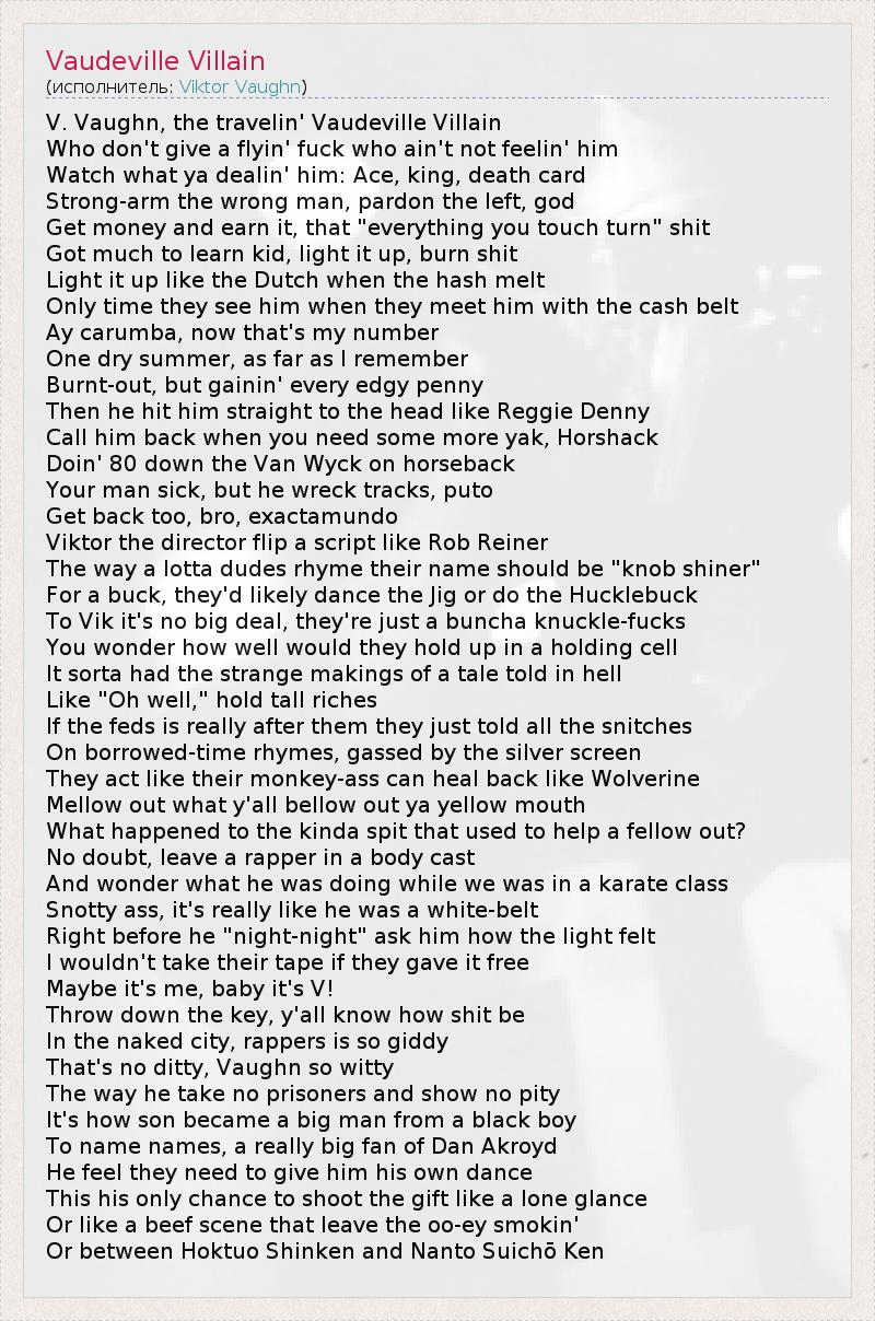 V. Vaughn, the travelin' Vaudeville Villain Who don't give a flyin' fuck who ain't not feelin' him Watch what ya dealin' him: Ace, king, death card Strong-arm the wrong man, pardon the left, god Get money and earn it, that "everything you touch turn" shit Got much to learn kid, light it up, burn shit Light it up like the Dutch when the hash melt Only time they see him when they meet him with the cash belt Ay carumba, now that's my number One dry summer, as far as I remember Burnt-out, but gainin' every edgy penny Then he hit him straight to the head like Reggie Denny Call him back when you need some more yak, Horshack Doin' 80 down the Van Wyck on horseback Your man sick, but he wreck tracks, puto Get back too, bro, exactamundo Viktor the director flip a script like Rob Reiner The way a lotta dudes rhyme their name should be "knob shiner" For a buck, they'd likely dance the Jig or do the Hucklebuck To Vik it's no big deal, they're just a buncha knuckle-fucks You wonder how well would they hold up in a holding cell It sorta had the strange makings of a tale told in hell Like "Oh well," hold tall riches If the feds is really after them they just told all the snitches On borrowed-time rhymes, gassed by the silver screen They act like their monkey-ass can heal back like Wolverine Mellow out what y'all bellow out ya yellow mouth What happened to the kinda spit that used to help a fellow out? No doubt, leave a rapper in a body cast And wonder what he was doing while we was in a karate class Snotty ass, it's really like he was a white-belt Right before he "night-night" ask him how the light felt I wouldn't take their tape if they gave it free Maybe it's me, baby it's V! Throw down the key, y'all know how shit be In the naked city, rappers is so giddy That's no ditty, Vaughn so witty The way he take no prisoners and show no pity It's how son became a big man from a black boy To name names, a really big fan of Dan Akroyd He feel they need to give him his own dance This his only chance to shoot the gift like a lone glance Or like a beef scene that leave the oo-ey smokin' Or between Hoktuo Shinken and Nanto Suichō Ken