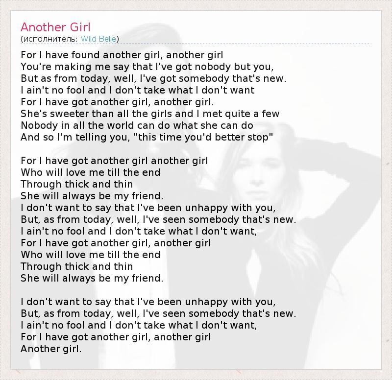 For I have found another girl, another girl You're making me say that I've got nobody but you, But as from today, well, I've got somebody that's new. I ain't no fool and I don't take what I don't want For I have got another girl, another girl. She's sweeter than all the girls and I met quite a few Nobody in all the world can do what she can do And so I'm telling you, "this time you'd better stop" For I have got another girl another girl Who will love me till the end Through thick and thin She will always be my friend. I don't want to say that I've been unhappy with you, But, as from today, well, I've seen somebody that's new. I ain't no fool and I don't take what I don't want, For I have got another girl, another girl Who will love me till the end Through thick and thin She will always be my friend. I don't want to say that I've been unhappy with you, But, as from today, well, I've seen somebody that's new. I ain't no fool and I don't take what I don't want, For I have got another girl, another girl Another girl.