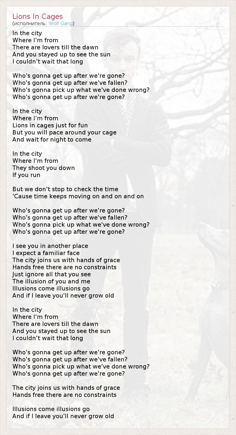 In the city Where I'm from There are lovers till the dawn And you stayed up to see the sun I couldn't wait that long Who's gonna get up after we're gone? Who's gonna get up after we've fallen? Who's gonna pick up what we've done wrong? Who's gonna get up after we're gone? In the city Where I'm from Lions in cages just for fun But you will pace around your cage And wait for night to come In the city Where I'm from They shoot you down If you run But we don't stop to check the time 'Cause time keeps moving on and on and on Who's gonna get up after we're gone? Who's gonna get up after we've fallen? Who's gonna pick up what we've done wrong? Who's gonna get up after we're gone? I see you in another place I expect a familiar face The city joins us with hands of grace Hands free there are no constraints Just ignore all that you see The illusion of you and me Illusions come illusions go And if I leave you'll never grow old In the city Where I'm from There are lovers till the dawn And you stayed up to see the sun I couldn't wait that long Who's gonna get up after we're gone? Who's gonna get up after we've fallen? Who's gonna pick up what we've done wrong? Who's gonna get up after we're gone? The city joins us with hands of grace Hands free there are no constraints Illusions come illusions go And if I leave you'll never grow old