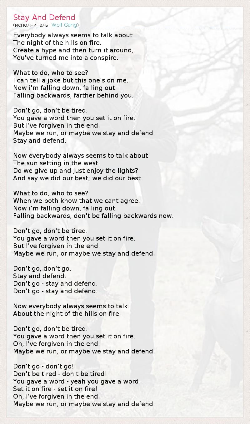 Everybody always seems to talk about The night of the hills on fire. Create a hype and then turn it around, You've turned me into a conspire. What to do, who to see? I can tell a joke but this one's on me. Now i'm falling down, falling out. Falling backwards, farther behind you. Don't go, don't be tired. You gave a word then you set it on fire. But I've forgiven in the end. Maybe we run, or maybe we stay and defend. Stay and defend. Now everybody always seems to talk about The sun setting in the west. Do we give up and just enjoy the lights? And say we did our best; we did our best. What to do, who to see? When we both know that we cant agree. Now i'm falling down, falling out. Falling backwards, don't be falling backwards now. Don't go, don't be tired. You gave a word then you set it on fire. But I've forgiven in the end. Maybe we run, or maybe we stay and defend. Don't go, don't go. Stay and defend. Don't go - stay and defend. Don't go - stay and defend. Now everybody always seems to talk About the night of the hills on fire. Don't go, don't be tired. You gave a word then you set it on fire. Oh, I've forgiven in the end. Maybe we run, or maybe we stay and defend. Don't go - don't go! Don't be tired - don't be tired! You gave a word - yeah you gave a word! Set it on fire - set it on fire! Oh, i've forgiven in the end. Maybe we run, or maybe we stay and defend.