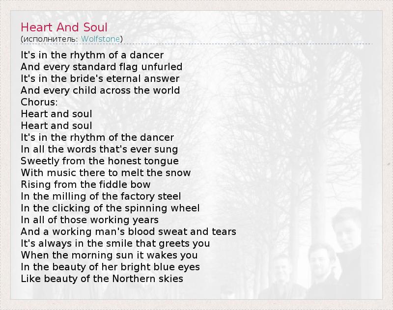 It's in the rhythm of a dancer And every standard flag unfurled It's in the bride's eternal answer And every child across the world Chorus: Heart and soul Heart and soul It's in the rhythm of the dancer In all the words that's ever sung Sweetly from the honest tongue With music there to melt the snow Rising from the fiddle bow In the milling of the factory steel In the clicking of the spinning wheel In all of those working years And a working man's blood sweat and tears It's always in the smile that greets you When the morning sun it wakes you In the beauty of her bright blue eyes Like beauty of the Northern skies