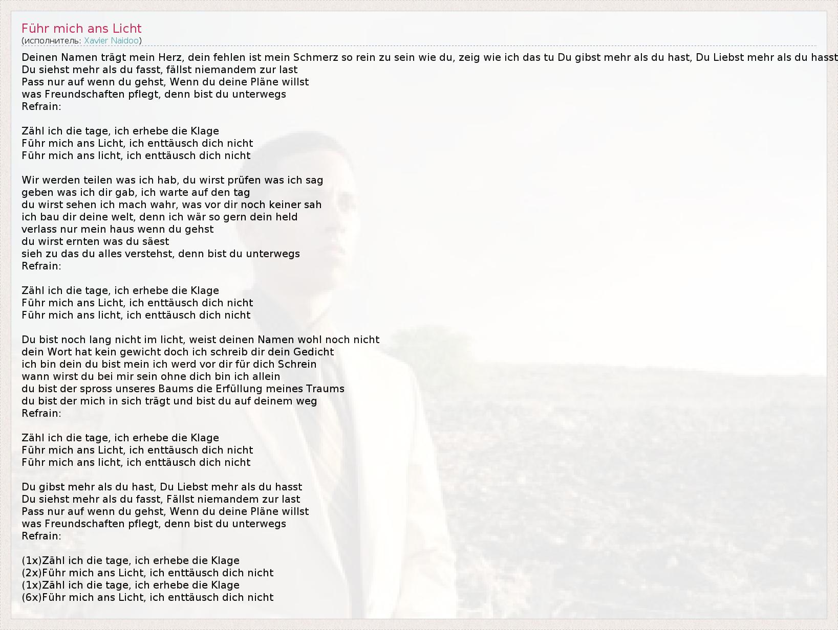 Deinen Namen trägt mein Herz, dein fehlen ist mein Schmerz so rein zu sein wie du, zeig wie ich das tu Du gibst mehr als du hast, Du Liebst mehr als du hasst