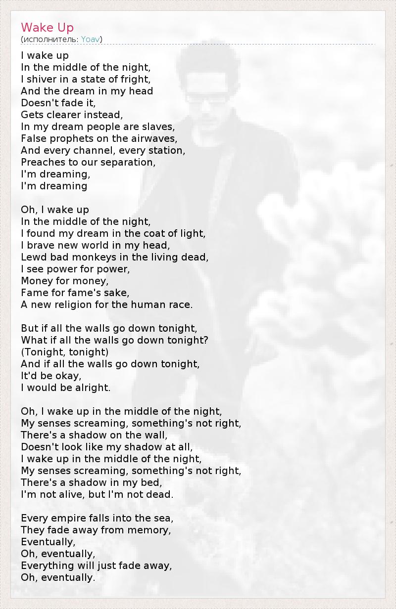 Я просыпаюсь Среди ночи В холодном поту, И этот сон в моей голове Не тускнеет, Становясь лишь четче. В моем сне люди - рабы. Фальшивые пророки на радиостанциях, На каждом канале, на каждой станции Проповедуют нашу классификацию. Я сплю, Сплю. Ах, я просыпаюсь Среди ночи. Мои сны окутаны светом, Я смело встречаю новый мир в моей голове, Похотливые скверные обезьяны - живые мертвецы, Я вижу власть ради власти, Деньги ради денег, Слава ради славы - Вот новая религия для человечества.. Но если все стены падут этой ночью... Что если все стены падут этой ночью? (Этой ночью, этой ночью) И если все стены падут этой ночью Все будет хорошо, Со мной все будет в порядке. Ах, я просыпаюсь среди ночи, Мое сознание кричит, что что-то не так, Тень на стене... Она совсем не похожа на мою тень... Я просыпаюсь среди ночи, Мое сознание кричит, что что-то не так, Тень на моей постели... Я не жив, но и не мертв.. Каждая империя падет в море И исчезнет из памяти В конце концов, Ох, со временем. Просто все исчезает Со временем...
