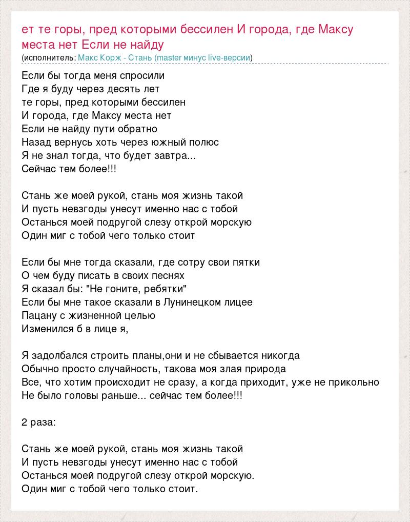 ГлавнаяИсполнителиМакс Корж - Стань (master минус live-версииЕт те горы, пред которыми бессилен И города, где Максу места нет Если не найду