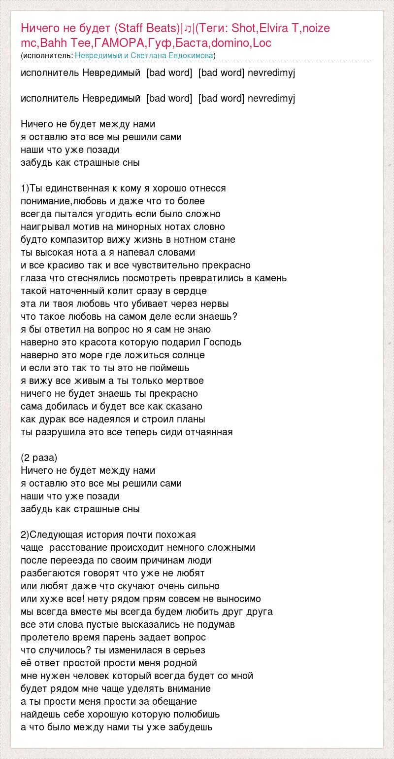 ГлавнаяИсполнителиНевредимый и Светлана ЕвдокимоваНичего не будет (Staff Beats)|♫|(Теги: Shot,Elvira T,noize mc,Bahh Tee,ГАМОРА