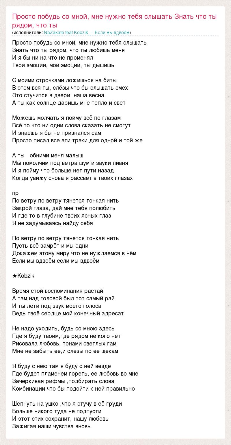 Главная→Исполнители→NaZakate feat Kobzik_-_Если мы вдвоём→Просто побудь со мной, мне нужно тебя слышать Знать что ты рядом, что ты