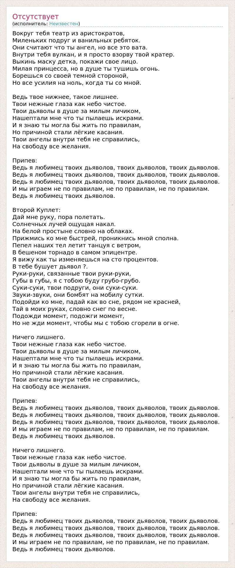 Вокруг тебя театр из аристократов, Миленьких подруг и ванильных ребяток. Они считают что ты ангел, но все это вата. Внутри тебя вулкан, и я просто взорву твой кратер. Выкинь маску детка, покажи свое лицо. Милая принцесса, но в душе ты тушишь огонь. Борешься со своей темной стороной, Но все усилия на ноль, когда ты со мной. Ведь твое нижнее, такое лишнее. Твои нежные глаза как небо чистое. Твои дьяволы в душе за милым личиком, Нашептали мне что ты пылаешь искрами. И я знаю ты могла бы жить по правилам, Но причиной стали лёгкие касания. Твои ангелы внутри тебя не справились, На свободу все желания. Припев: Ведь я любимец твоих дьяволов, твоих дьяволов, твоих дьяволов. Ведь я любимец твоих дьяволов, твоих дьяволов, твоих дьяволов. Ведь я любимец твоих дьяволов, твоих дьяволов, твоих дьяволов. И мы играем не по правилам, не по правилам, не по правилам. Ведь я любимец твоих дьяволов. Второй Куплет: Дай мне руку, пора полетать. Солнечных лучей ощущая накал. На белой простыне словно на облаках. Прижмись ко мне быстрей, проникнись мной сполна. Пепел наших тел летит танцуя с ветром, В бешеном торнадо в самом эпицентре. Я вижу как ты изменяешься на сто процентов. В тебе бушует дьявол ?. Руки-руки, связанные твои руки-руки, Губы в губы, я с тобою буду грубо-грубо. Суки-суки, твои подруги, они суки-суки. Звуки-звуки, они бомбят на мобилу сутки. Подойди ко мне, падай как во сне, рядом не красней, Тай в моих руках, словно снег по весне. Подожди момент, подожги момент, Но не жди момент, чтобы мы с тобою сгорели в огне. Ничего лишнего. Твои нежные глаза как небо чистое. Твои дьяволы в душе за милым личиком, Нашептали мне что ты пылаешь искрами. И я знаю ты могла бы жить по правилам, Но причиной стали лёгкие касания. Твои ангелы внутри тебя не справились, На свободу все желания. Припев: Ведь я любимец твоих дьяволов, твоих дьяволов, твоих дьяволов. Ведь я любимец твоих дьяволов, твоих дьяволов, твоих дьяволов. Ведь я любимец твоих дьяволов, твоих дьяволов, твоих дьяволов. И мы играем не по правилам, не по правилам, не по правилам. Ведь я любимец твоих дьяволов. Ничего лишнего. Твои нежные глаза как небо чистое. Твои дьяволы в душе за милым личиком, Нашептали мне что ты пылаешь искрами. И я знаю ты могла бы жить по правилам, Но причиной стали лёгкие касания. Твои ангелы внутри тебя не справились, На свободу все желания. Припев: Ведь я любимец твоих дьяволов, твоих дьяволов, твоих дьяволов. Ведь я любимец твоих дьяволов, твоих дьяволов, твоих дьяволов. Ведь я любимец твоих дьяволов, твоих дьяволов, твоих дьяволов. И мы играем не по правилам, не по правилам, не по правилам. Ведь я любимец твоих дьяволов.