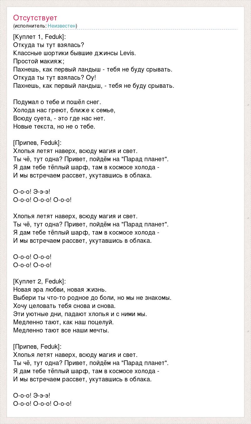 [Куплет 1, Feduk]: Откуда ты тут взялась? Классные шортики бывшие джинсы Levis. Простой макияж; Пахнешь, как первый ландыш - тебя не буду срывать. Откуда ты тут взялась? Оу! Пахнешь, как первый ландыш, - тебя не буду срывать. Подумал о тебе и пошёл снег. Холода нас греют, ближе к семье, Всюду суета, - это где нас нет. Новые текста, но не о тебе. [Припев, Feduk]: Хлопья летят наверх, всюду магия и свет. Ты чё, тут одна? Привет, пойдём на "Парад планет". Я дам тебе тёплый шарф, там в космосе холода - И мы встречаем рассвет, укутавшись в облака. О-о-о! Э-э-э! О-о-о! О-о-о! О-о-о! Хлопья летят наверх, всюду магия и свет. Ты чё, тут одна? Привет, пойдём на "Парад планет". Я дам тебе тёплый шарф, там в космосе холода - И мы встречаем рассвет, укутавшись в облака. О-о-о! О-о-о! О-о-о! О-о-о! [Куплет 2, Feduk]: Новая эра любви, новая жизнь. Выбери ты что-то родное до боли, но мы не знакомы. Хочу целовать тебя снова и снова. Эти уютные дни, падают хлопья и с ними мы. Медленно тают, как наш поцелуй. Медленно тают все наши мечты. [Припев, Feduk]: Хлопья летят наверх, всюду магия и свет. Ты чё, тут одна? Привет, пойдём на "Парад планет". Я дам тебе тёплый шарф, там в космосе холода - И мы встречаем рассвет, укутавшись в облака. О-о-о! Э-э-э! О-о-о! О-о-о! О-о-о!