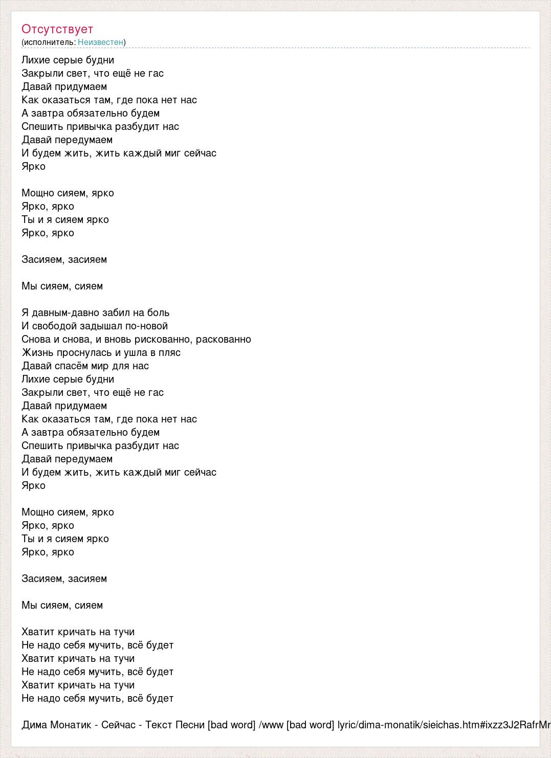 Лихие серые будни Закрыли свет, что ещё не гас Давай придумаем Как оказаться там, где пока нет нас А завтра обязательно будем Спешить привычка разбудит нас Давай передумаем И будем жить, жить каждый миг сейчас Ярко Мощно сияем, ярко Ярко, ярко Ты и я сияем ярко Ярко, ярко Засияем, засияем Мы сияем, сияем Я давным-давно забил на боль И свободой задышал по-новой Снова и снова, и вновь рискованно, раскованно Жизнь проснулась и ушла в пляс Давай спасём мир для нас Лихие серые будни Закрыли свет, что ещё не гас Давай придумаем Как оказаться там, где пока нет нас А завтра обязательно будем Спешить привычка разбудит нас Давай передумаем И будем жить, жить каждый миг сейчас Ярко Мощно сияем, ярко Ярко, ярко Ты и я сияем ярко Ярко, ярко Засияем, засияем Мы сияем, сияем Хватит кричать на тучи Не надо себя мучить, всё будет Хватит кричать на тучи Не надо себя мучить, всё будет Хватит кричать на тучи Не надо себя мучить, всё будет Дима Монатик - Сейчас - Текст Песни [bad word] /www [bad word] lyric/dima-monatik/sieichas.htm#ixzz3J2RafrMr