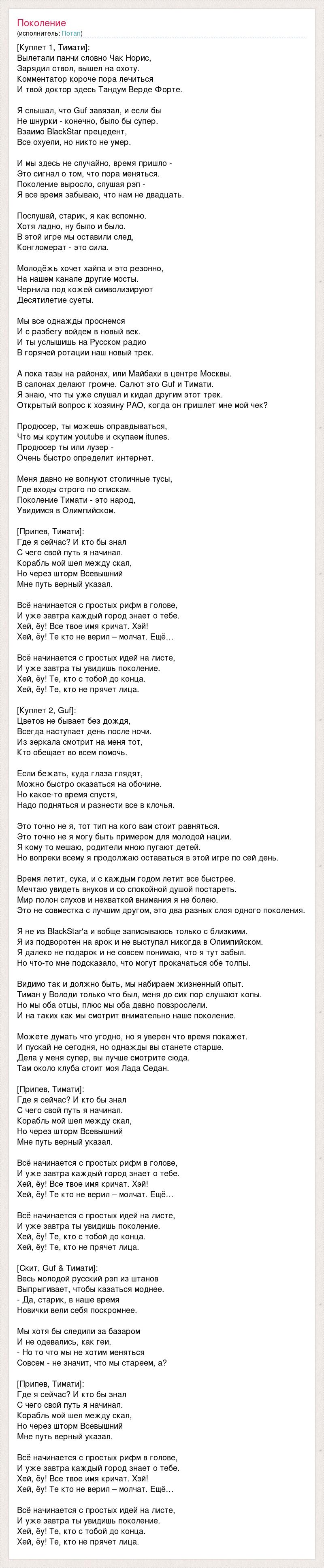 [Куплет 1, Тимати]: Вылетали панчи словно Чак Норис, Зарядил ствол, вышел на охоту. Комментатор короче пора лечиться И твой доктор здесь Тандум Верде Форте. Я слышал, что Guf завязал, и если бы Не шнурки - конечно, было бы супер. Взаимо BlackStar прецедент, Все охуели, но никто не умер. И мы здесь не случайно, время пришло - Это сигнал о том, что пора меняться. Поколение выросло, слушая рэп - Я все время забываю, что нам не двадцать. Послушай, старик, я как вспомню. Хотя ладно, ну было и было. В этой игре мы оставили след, Конгломерат - это сила. Молодёжь хочет хайпа и это резонно, На нашем канале другие мосты. Чернила под кожей символизируют Десятилетие суеты. Мы все однажды проснемся И с разбегу войдем в новый век. И ты услышишь на Русском радио В горячей ротации наш новый трек. А пока тазы на районах, или Майбахи в центре Москвы. В салонах делают громче. Салют это Guf и Тимати. Я знаю, что ты уже слушал и кидал другим этот трек. Открытый вопрос к хозяину РАО, когда он пришлет мне мой чек? Продюсер, ты можешь оправдываться, Что мы крутим youtube и скупаем itunes. Продюсер ты или лузер - Очень быстро определит интернет. Меня давно не волнуют столичные тусы, Где входы строго по спискам. Поколение Тимати - это народ, Увидимся в Олимпийском. [Припев, Тимати]: Где я сейчас? И кто бы знал С чего свой путь я начинал. Корабль мой шел между скал, Но через шторм Всевышний Мне путь верный указал. Всё начинается с простых рифм в голове, И уже завтра каждый город знает о тебе. Хей, ёу! Все твое имя кричат. Хэй! Хей, ёу! Те кто не верил – молчат. Ещё… Всё начинается с простых идей на листе, И уже завтра ты увидишь поколение. Хей, ёу! Те, кто с тобой до конца. Хей, ёу! Те, кто не прячет лица. [Куплет 2, Guf]: Цветов не бывает без дождя, Всегда наступает день после ночи. Из зеркала смотрит на меня тот, Кто обещает во всем помочь. Если бежать, куда глаза глядят, Можно быстро оказаться на обочине. Но какое-то время спустя, Надо подняться и разнести все в клочья. Это точно не я, тот тип на кого вам стоит равняться. Это точно не я могу быть примером для молодой нации. Я кому то мешаю, родители мною пугают детей. Но вопреки всему я продолжаю оставаться в этой игре по сей день. Время летит, сука, и с каждым годом летит все быстрее. Мечтаю увидеть внуков и со спокойной душой постареть. Мир полон слухов и нехваткой внимания я не болею. Это не совместка с лучшим другом, это два разных слоя одного поколения. Я не из BlackStar'а и вобще записываюсь только с близкими. Я из подворотен на арок и не выступал никогда в Олимпийском. Я далеко не подарок и не совсем понимаю, что я тут забыл. Но что-то мне подсказало, что могут прокачаться обе толпы. Видимо так и должно быть, мы набираем жизненный опыт. Тиман у Володи только что был, меня до сих пор слушают копы. Но мы оба отцы, плюс мы оба давно повзрослели. И на таких как мы смотрит внимательно наше поколение. Можете думать что угодно, но я уверен что время покажет. И пускай не сегодня, но однажды вы станете старше. Дела у меня супер, вы лучше смотрите сюда. Там около клуба стоит моя Лада Седан. [Припев, Тимати]: Где я сейчас? И кто бы знал С чего свой путь я начинал. Корабль мой шел между скал, Но через шторм Всевышний Мне путь верный указал. Всё начинается с простых рифм в голове, И уже завтра каждый город знает о тебе. Хей, ёу! Все твое имя кричат. Хэй! Хей, ёу! Те кто не верил – молчат. Ещё… Всё начинается с про