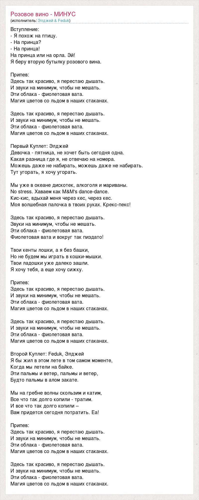 Вступление: - Я похож на птицу. - На принца? - На принца! На принца или на орла. Эй! Я беру вторую бутылку розового вина. Припев: Здесь так красиво, я перестаю дышать. И звуки на минимум, чтобы не мешать. Эти облака - фиолетовая вата. Магия цветов со льдом в наших стаканах. Здесь так красиво, я перестаю дышать. И звуки на минимум, чтобы не мешать. Эти облака - фиолетовая вата. Магия цветов со льдом в наших стаканах. Первый Куплет: Элджей Девочка - пятница, не хочет быть сегодня одна. Какая разница где я, не отвечаю на номера. Можешь даже не набирать, можешь даже не набирать. Тут угорать, я хочу угорать. Мы уже в океане дискотек, алкоголя и мариваны. No stress. Хаваем как M&M's dance-dance. Кис-кис, вдыхай меня через кес, через кес. Моя волшебная палочка в твоих руках. Крекс-пекс! Здесь так красиво, я перестаю дышать. Звуки на минимум, чтобы не мешать. Эти облака - фиолетовая вата. Фиолетовая вата и вокруг так пиздато! Твои кенты лошки, а я без башки, Но не будем мы играть в кошки-мышки. Твои ладошки уже далеко зашли. Я хочу тебя, а еще хочу сижку. Припев: Здесь так красиво, я перестаю дышать. И звуки на минимум, чтобы не мешать. Эти облака - фиолетовая вата. Магия цветов со льдом в наших стаканах. Здесь так красиво, я перестаю дышать. И звуки на минимум, чтобы не мешать. Эти облака - фиолетовая вата. Магия цветов со льдом в наших стаканах. Второй Куплет: Feduk, Элджей Я бы жил в этом лете в том самом моменте, Когда мы летели на байке. Эти пальмы и ветер, пальмы и ветер, Будто пальмы в алом закате. Мы на гребне волны скользим и катим, Все что так долго копили - тратим. И все что так долго копили – Вам придется сегодня потратить. Еа! Припев: Здесь так красиво, я перестаю дышать. И звуки на минимум, чтобы не мешать. Эти облака - фиолетовая вата. Магия цветов со льдом в наших стаканах. Здесь так красиво, я перестаю дышать. И звуки на минимум, чтобы не мешать. Эти облака - фиолетовая вата. Магия цветов со льдом в наших стаканах.