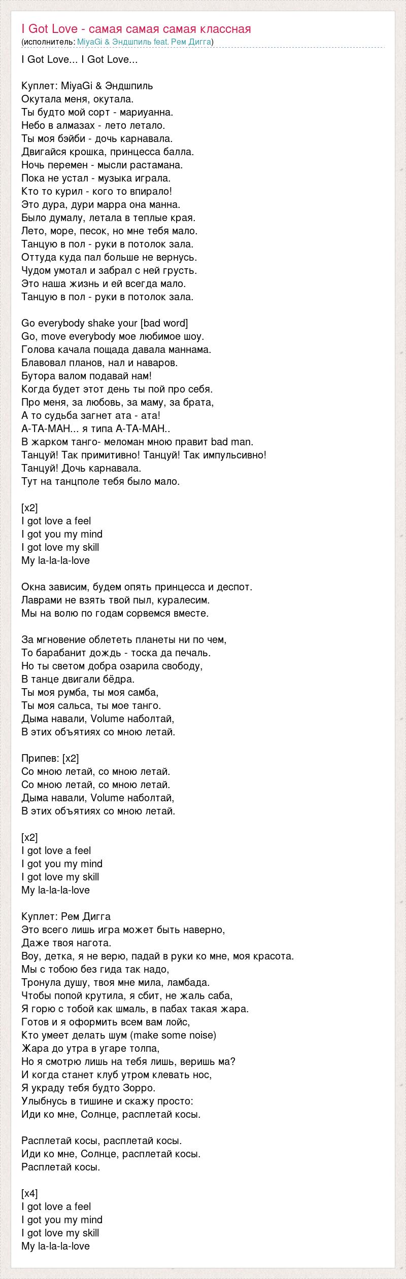 I Got Love... I Got Love... Куплет: MiyaGi & Эндшпиль Окутала меня, окутала. Ты будто мой сорт - мариуанна. Небо в алмазах - лето летало. Ты моя бэйби - дочь карнавала. Двигайся крошка, принцесса балла. Ночь перемен - мысли растамана. Пока не устал - музыка играла. Кто то курил - кого то впирало! Это дура, дури марра она манна. Было думалу, летала в теплые края. Лето, море, песок, но мне тебя мало. Танцую в пол - руки в потолок зала. Оттуда куда пал больше не вернусь. Чудом умотал и забрал с ней грусть. Это наша жизнь и ей всегда мало. Танцую в пол - руки в потолок зала. Go everybody shake your [bad word] Go, move everybody мое любимое шоу. Голова качала пощада давала маннама. Блавовал планов, нал и наваров. Бутора валом подавай нам! Когда будет этот день ты пой про себя. Про меня, за любовь, за маму, за брата, А то судьба загнет ата - ата! А-ТА-МАН... я типа А-ТА-МАН.. В жарком танго- меломан мною правит bad man. Танцуй! Так примитивно! Танцуй! Так импульсивно! Танцуй! Дочь карнавала. Тут на танцполе тебя было мало. [x2] I got love a feel I got you my mind I got love my skill My la-la-la-love Окна зависим, будем опять принцесса и деспот. Лаврами не взять твой пыл, куралесим. Мы на волю по годам сорвемся вместе. За мгновение облететь планеты ни по чем, То барабанит дождь - тоска да печаль. Но ты светом добра озарила свободу, В танце двигали бёдра. Ты моя румба, ты моя самба, Ты моя сальса, ты мое танго. Дыма навали, Volume наболтай, В этих объятиях со мною летай. Припев: [х2] Со мною летай, со мною летай. Со мною летай, со мною летай. Дыма навали, Volume наболтай, В этих объятиях со мною летай. [х2] I got love a feel I got you my mind I got love my skill My la-la-la-love Куплет: Рем Дигга Это всего лишь игра может быть наверно, Даже твоя нагота. Воу, детка, я не верю, падай в руки ко мне, моя красота. Мы с тобою без гида так надо, Тронула душу, твоя мне мила, ламбада. Чтобы попой крутила, я сбит, не жаль саба, Я горю с тобой как шмаль, в пабах такая жара. Готов и я оформить всем вам лойс, Кто умеет делать шум (make some noise) Жара до утра в угаре толпа, Но я смотрю лишь на тебя лишь, веришь ма? И когда станет клуб утром клевать нос, Я украду тебя будто Зорро. Улыбнусь в тишине и скажу просто: Иди ко мне, Солнце, расплетай косы. Расплетай косы, расплетай косы. Иди ко мне, Солнце, расплетай косы. Расплетай косы. [x4] I got love a feel I got you my mind I got love my skill My la-la-la-love