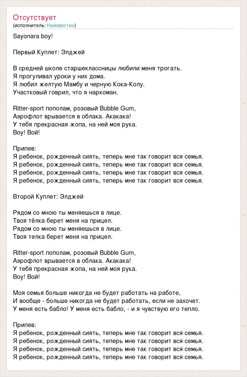 Sayonara boy! Первый Куплет: Элджей В средней школе старшеклассницы любили меня трогать. Я прогуливал уроки у них дома. Я любил желтую Мамбу и черную Кока-Колу. Участковый говрил, что я наркоман. Ritter-sport пополам, розовый Bubble Gum, Аэрофлот врывается в облака. Акакака! У тебя прекрасная жопа, на ней моя рука. Воу! Вой! Припев: Я ребенок, рожденный сиять, теперь мне так говорит вся семья. Я ребенок, рожденный сиять, теперь мне так говорит вся семья. Я ребенок, рожденный сиять, теперь мне так говорит вся семья. Я ребенок, рожденный сиять, теперь мне так говорит вся семья. Второй Куплет: Элджей Рядом со мною ты меняешься в лице. Твоя тёлка берет меня на прицел. Рядом со мною ты меняешься в лице. Твоя телка берет меня на прицел. Ritter-sport пополам, розовый Bubble Gum, Аэрофлот врывается в облака. Акакака! У тебя прекрасная жопа, на ней моя рука. Воу! Вой! Моя семья больше никогда не будет работать на работе, И вообще - больше никогда не будет работать, если не захочет. У меня есть бабло! У меня есть бабло, - и я чувствую его тепло. Припев: Я ребенок, рожденный сиять, теперь мне так говорит вся семья. Я ребенок, рожденный сиять, теперь мне так говорит вся семья. Я ребенок, рожденный сиять, теперь мне так говорит вся семья. Я ребенок, рожденный сиять, теперь мне так говорит вся семья.