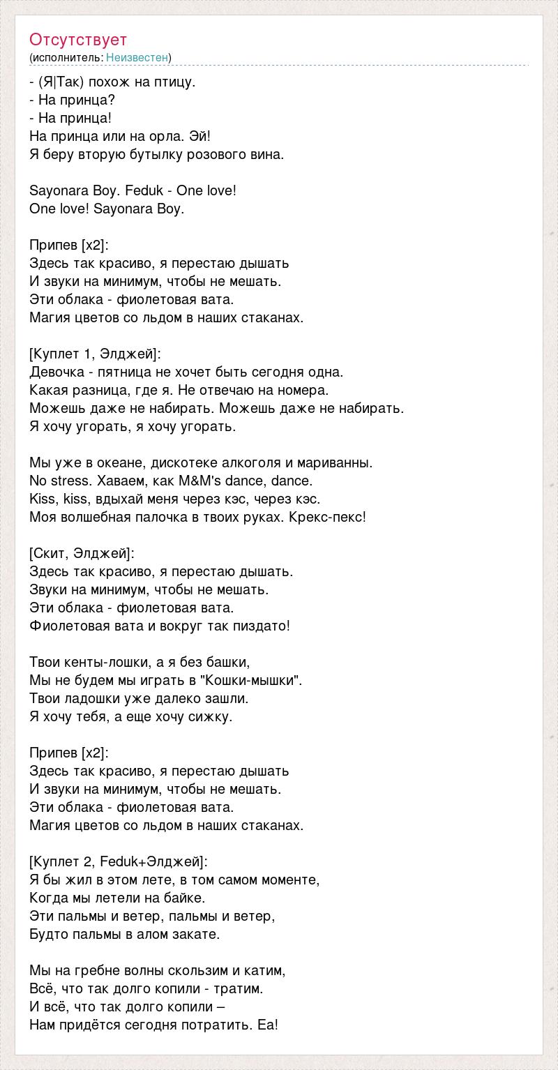 - (Я|Так) похож на птицу. - На принца? - На принца! На принца или на орла. Эй! Я беру вторую бутылку розового вина. Sayonara Boy. Feduk - One love! One love! Sayonara Boy. Припев [x2]: Здесь так красиво, я перестаю дышать И звуки на минимум, чтобы не мешать. Эти облака - фиолетовая вата. Магия цветов со льдом в наших стаканах. [Куплет 1, Элджей]: Девочка - пятница не хочет быть сегодня одна. Какая разница, где я. Не отвечаю на номера. Можешь даже не набирать. Можешь даже не набирать. Я хочу угорать, я хочу угорать. Мы уже в океане, дискотеке алкоголя и мариванны. No stress. Хаваем, как M&M's dance, dance. Kiss, kiss, вдыхай меня через кэс, через кэс. Моя волшебная палочка в твоих руках. Крекс-пекс! [Скит, Элджей]: Здесь так красиво, я перестаю дышать. Звуки на минимум, чтобы не мешать. Эти облака - фиолетовая вата. Фиолетовая вата и вокруг так пиздато! Твои кенты-лошки, а я без башки, Мы не будем мы играть в "Кошки-мышки". Твои ладошки уже далеко зашли. Я хочу тебя, а еще хочу сижку. Припев [x2]: Здесь так красиво, я перестаю дышать И звуки на минимум, чтобы не мешать. Эти облака - фиолетовая вата. Магия цветов со льдом в наших стаканах. [Куплет 2, Feduk+Элджей]: Я бы жил в этом лете, в том самом моменте, Когда мы летели на байке. Эти пальмы и ветер, пальмы и ветер, Будто пальмы в алом закате. Мы на гребне волны скользим и катим, Всё, что так долго копили - тратим. И всё, что так долго копили – Нам придётся сегодня потратить. Еа!