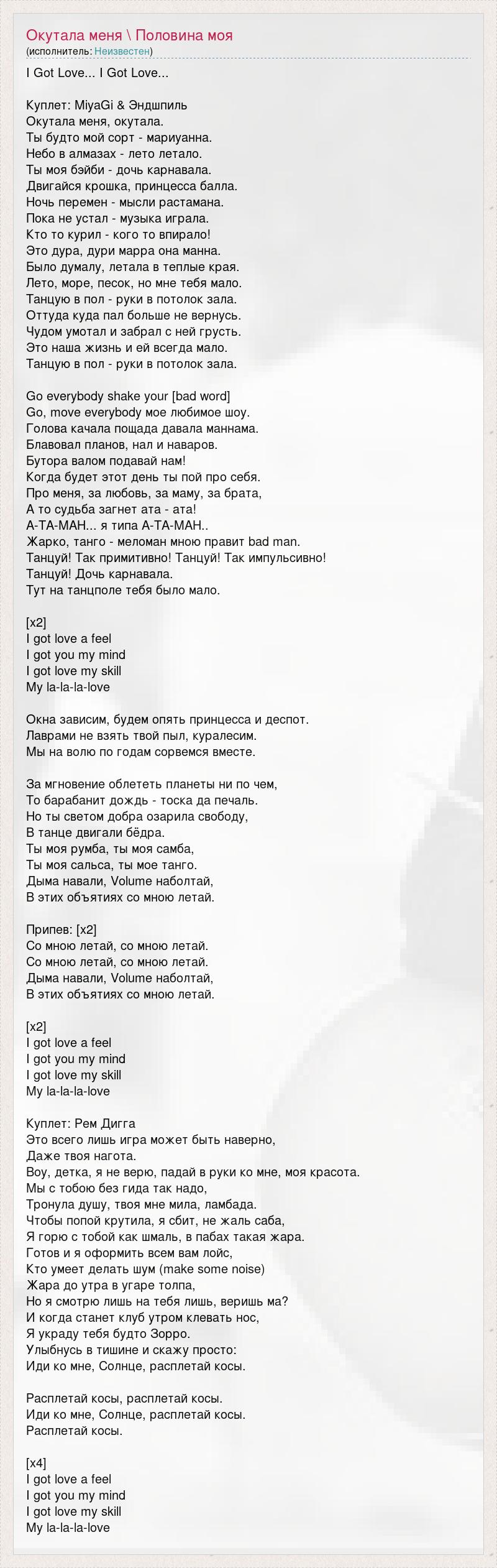 I Got Love... I Got Love... Куплет: MiyaGi & Эндшпиль Окутала меня, окутала. Ты будто мой сорт - мариуанна. Небо в алмазах - лето летало. Ты моя бэйби - дочь карнавала. Двигайся крошка, принцесса балла. Ночь перемен - мысли растамана. Пока не устал - музыка играла. Кто то курил - кого то впирало! Это дура, дури марра она манна. Было думалу, летала в теплые края. Лето, море, песок, но мне тебя мало. Танцую в пол - руки в потолок зала. Оттуда куда пал больше не вернусь. Чудом умотал и забрал с ней грусть. Это наша жизнь и ей всегда мало. Танцую в пол - руки в потолок зала. Go everybody shake your [bad word] Go, move everybody мое любимое шоу. Голова качала пощада давала маннама. Блавовал планов, нал и наваров. Бутора валом подавай нам! Когда будет этот день ты пой про себя. Про меня, за любовь, за маму, за брата, А то судьба загнет ата - ата! А-ТА-МАН... я типа А-ТА-МАН.. Жарко, танго - меломан мною правит bad man. Танцуй! Так примитивно! Танцуй! Так импульсивно! Танцуй! Дочь карнавала. Тут на танцполе тебя было мало. [x2] I got love a feel I got you my mind I got love my skill My la-la-la-love Окна зависим, будем опять принцесса и деспот. Лаврами не взять твой пыл, куралесим. Мы на волю по годам сорвемся вместе. За мгновение облететь планеты ни по чем, То барабанит дождь - тоска да печаль. Но ты светом добра озарила свободу, В танце двигали бёдра. Ты моя румба, ты моя самба, Ты моя сальса, ты мое танго. Дыма навали, Volume наболтай, В этих объятиях со мною летай. Припев: [х2] Со мною летай, со мною летай. Со мною летай, со мною летай. Дыма навали, Volume наболтай, В этих объятиях со мною летай. [х2] I got love a feel I got you my mind I got love my skill My la-la-la-love Куплет: Рем Дигга Это всего лишь игра может быть наверно, Даже твоя нагота. Воу, детка, я не верю, падай в руки ко мне, моя красота. Мы с тобою без гида так надо, Тронула душу, твоя мне мила, ламбада. Чтобы попой крутила, я сбит, не жаль саба, Я горю с тобой как шмаль, в пабах такая жара. Готов и я оформить всем вам лойс, Кто умеет делать шум (make some noise) Жара до утра в угаре толпа, Но я смотрю лишь на тебя лишь, веришь ма? И когда станет клуб утром клевать нос, Я украду тебя будто Зорро. Улыбнусь в тишине и скажу просто: Иди ко мне, Солнце, расплетай косы. Расплетай косы, расплетай косы. Иди ко мне, Солнце, расплетай косы. Расплетай косы. [x4] I got love a feel I got you my mind I got love my skill My la-la-la-love