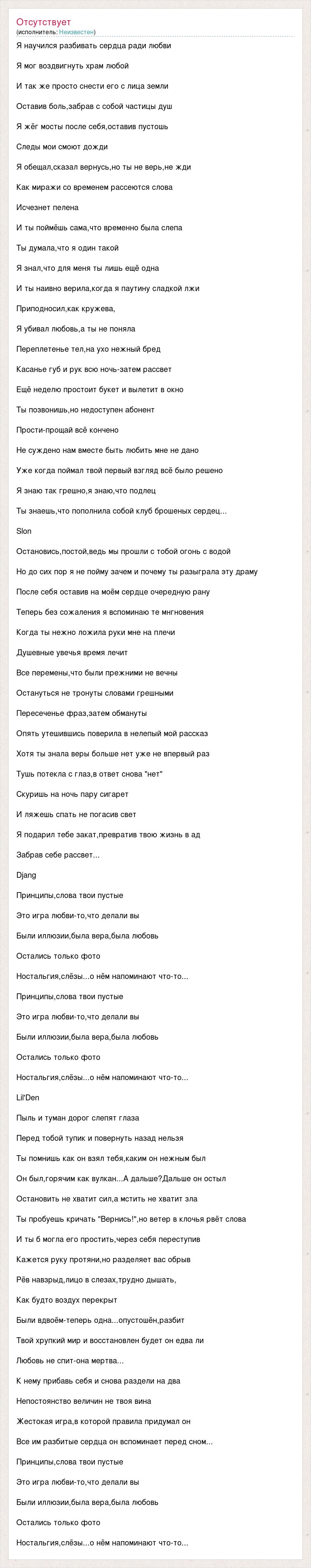 Я научился разбивать сердца ради любви Я мог воздвигнуть храм любой И так же просто снести его с лица земли Оставив боль,забрав с собой частицы душ Я жёг мосты после себя,оставив пустошь Следы мои смоют дожди Я обещал,сказал вернусь,но ты не верь,не жди Как миражи со временем рассеются слова Исчезнет пелена И ты поймёшь сама,что временно была слепа Ты думала,что я один такой Я знал,что для меня ты лишь ещё одна И ты наивно верила,когда я паутину сладкой лжи Приподносил,как кружева, Я убивал любовь,а ты не поняла Переплетенье тел,на ухо нежный бред Касанье губ и рук всю ночь-затем рассвет Ещё неделю простоит букет и вылетит в окно Ты позвонишь,но недоступен абонент Прости-прощай всё кончено Не суждено нам вместе быть любить мне не дано Уже когда поймал твой первый взгляд всё было решено Я знаю так грешно,я знаю,что подлец Ты знаешь,что пополнила собой клуб брошеных сердец... Slon Остановись,постой,ведь мы прошли с тобой огонь с водой Но до сих пор я не пойму зачем и почему ты разыграла эту драму После себя оставив на моём сердце очередную рану Теперь без сожаления я вспоминаю те мнгновения Когда ты нежно ложила руки мне на плечи Душевные увечья время лечит Все перемены,что были прежними не вечны Остануться не тронуты словами грешными Пересеченье фраз,затем обмануты Опять утешившись поверила в нелепый мой рассказ Хотя ты знала веры больше нет уже не впервый раз Тушь потекла с глаз,в ответ снова "нет" Скуришь на ночь пару сигарет И ляжешь спать не погасив свет Я подарил тебе закат,превратив твою жизнь в ад Забрав себе рассвет... Djang Принципы,слова твои пустые Это игра любви-то,что делали вы Были иллюзии,была вера,была любовь Остались только фото Ностальгия,слёзы...о нём напоминают что-то... Принципы,слова твои пустые Это игра любви-то,что делали вы Были иллюзии,была вера,была любовь Остались только фото Ностальгия,слёзы...о нём напоминают что-то... Lil'Den Пыль и туман дорог слепят глаза Перед тобой тупик и повернуть назад нельзя Ты помнишь как он взял тебя,каким он нежным был Он был,горячим как вулкан...А дальше?Дальше он остыл Остановить не хватит сил,а мстить не хватит зла Ты пробуешь кричать "Вернись!",но ветер в клочья рвёт слова И ты б могла его простить,через себя переступив Кажется руку протяни,но разделяет вас обрыв Рёв навзрыд,лицо в слезах,трудно дышать, Как будто воздух перекрыт Были вдвоём-теперь одна...опустошён,разбит Твой хрупкий мир и восстановлен будет он едва ли Любовь не спит-она мертва... К нему прибавь себя и снова раздели на два Непостоянство величин не твоя вина Жестокая игра,в которой правила придумал он Все им разбитые сердца он вспоминает перед сном... Принципы,слова твои пустые Это игра любви-то,что делали вы Были иллюзии,была вера,была любовь Остались только фото Ностальгия,слёзы...о нём напоминают что-то...
