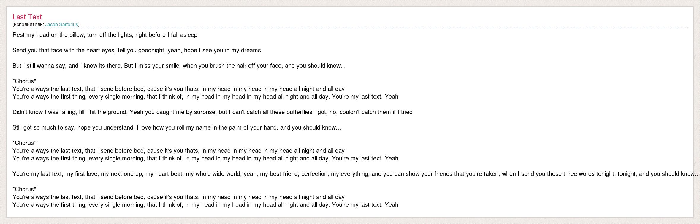 Rest my head on the pillow, turn off the lights, right before I fall asleep Send you that face with the heart eyes, tell you goodnight, yeah, hope I see you in my dreams But I still wanna say, and I know its there, But I miss your smile, when you brush the hair off your face, and you should know... *Chorus* You're always the last text, that I send before bed, cause it's you thats, in my head in my head in my head all night and all day You're always the first thing, every single morning, that I think of, in my head in my head in my head all night and all day. You're my last text. Yeah Didn't know I was falling, till I hit the ground, Yeah you caught me by surprise, but I can't catch all these butterflies I got, no, couldn't catch them if I tried Still got so much to say, hope you understand, I love how you roll my name in the palm of your hand, and you should know... *Chorus* You're always the last text, that I send before bed, cause it's you thats, in my head in my head in my head all night and all day You're always the first thing, every single morning, that I think of, in my head in my head in my head all night and all day. You're my last text. Yeah You're my last text, my first love, my next one up, my heart beat, my whole wide world, yeah, my best friend, perfection, my everything, and you can show your friends that you're taken, when I send you those three words tonight, tonight, and you should know... *Chorus* You're always the last text, that I send before bed, cause it's you thats, in my head in my head in my head all night and all day You're always the first thing, every single morning, that I think of, in my head in my head in my head all night and all day. You're my last text. Yeah