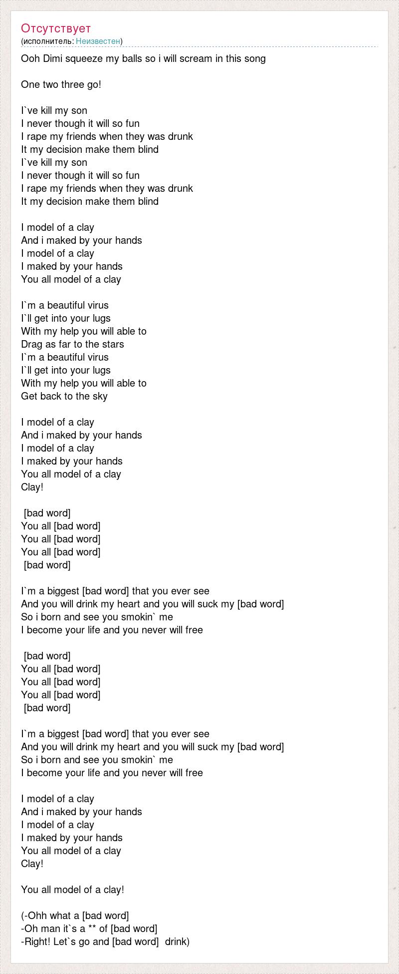 Ooh Dimi squeeze my balls so i will scream in this song One two three go! I`ve kill my son I never though it will so fun I rape my friends when they was drunk It my decision make them blind I`ve kill my son I never though it will so fun I rape my friends when they was drunk It my decision make them blind I model of a clay And i maked by your hands I model of a clay I maked by your hands You all model of a clay I`m a beautiful virus I`ll get into your lugs With my help you will able to Drag as far to the stars I`m a beautiful virus I`ll get into your lugs With my help you will able to Get back to the sky I model of a clay And i maked by your hands I model of a clay I maked by your hands You all model of a clay Clay! [bad word] You all [bad word] You all [bad word] You all [bad word] [bad word] I`m a biggest [bad word] that you ever see And you will drink my heart and you will suck my [bad word] So i born and see you smokin` me I become your life and you never will free [bad word] You all [bad word] You all [bad word] You all [bad word] [bad word] I`m a biggest [bad word] that you ever see And you will drink my heart and you will suck my [bad word] So i born and see you smokin` me I become your life and you never will free I model of a clay And i maked by your hands I model of a clay I maked by your hands You all model of a clay Clay! You all model of a clay! (-Ohh what a [bad word] -Oh man it`s a ** of [bad word] -Right! Let`s go and [bad word] drink)