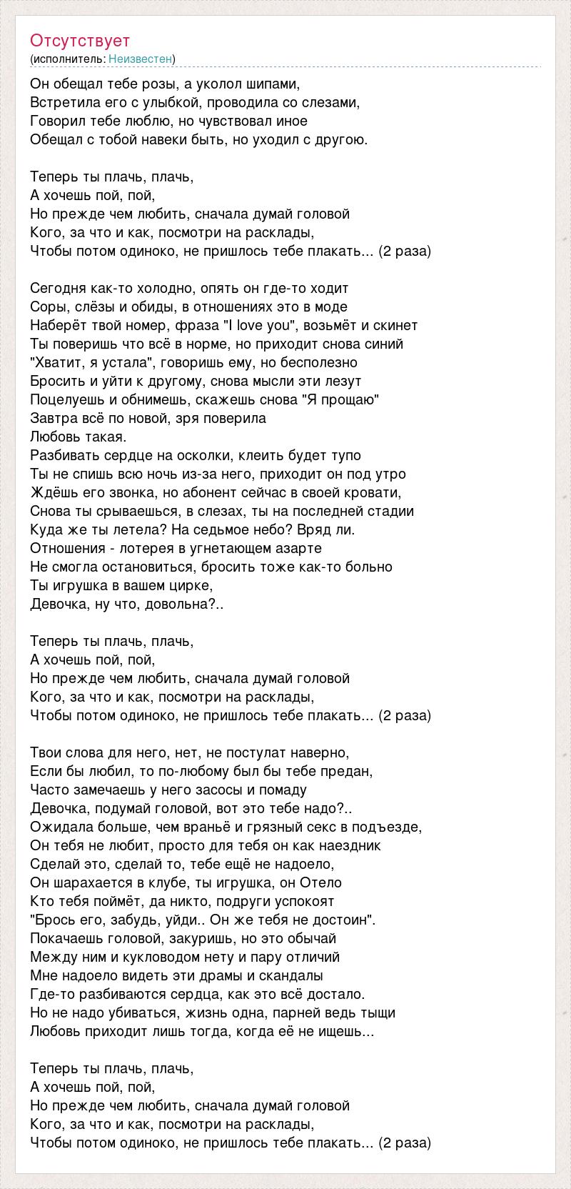 Он обещал тебе розы, а уколол шипами, Встретила его с улыбкой, проводила со слезами, Говорил тебе люблю, но чувствовал иное Обещал с тобой навеки быть, но уходил с другою. Теперь ты плачь, плачь, А хочешь пой, пой, Но прежде чем любить, сначала думай головой Кого, за что и как, посмотри на расклады, Чтобы потом одиноко, не пришлось тебе плакать... (2 раза) Сегодня как-то холодно, опять он где-то ходит Соры, слёзы и обиды, в отношениях это в моде Наберёт твой номер, фраза "I love you", возьмёт и скинет Ты поверишь что всё в норме, но приходит снова синий "Хватит, я устала", говоришь ему, но бесполезно Бросить и уйти к другому, снова мысли эти лезут Поцелуешь и обнимешь, скажешь снова "Я прощаю" Завтра всё по новой, зря поверила Любовь такая. Разбивать сердце на осколки, клеить будет тупо Ты не спишь всю ночь из-за него, приходит он под утро Ждёшь его звонка, но абонент сейчас в своей кровати, Снова ты срываешься, в слезах, ты на последней стадии Куда же ты летела? На седьмое небо? Вряд ли. Отношения - лотерея в угнетающем азарте Не смогла остановиться, бросить тоже как-то больно Ты игрушка в вашем цирке, Девочка, ну что, довольна?.. Теперь ты плачь, плачь, А хочешь пой, пой, Но прежде чем любить, сначала думай головой Кого, за что и как, посмотри на расклады, Чтобы потом одиноко, не пришлось тебе плакать... (2 раза) Твои слова для него, нет, не постулат наверно, Если бы любил, то по-любому был бы тебе предан, Часто замечаешь у него засосы и помаду Девочка, подумай головой, вот это тебе надо?.. Ожидала больше, чем враньё и грязный секс в подъезде, Он тебя не любит, просто для тебя он как наездник Сделай это, сделай то, тебе ещё не надоело, Он шарахается в клубе, ты игрушка, он Отело Кто тебя поймёт, да никто, подруги успокоят "Брось его, забудь, уйди.. Он же тебя не достоин". Покачаешь головой, закуришь, но это обычай Между ним и кукловодом нету и пару отличий Мне надоело видеть эти драмы и скандалы Где-то разбиваются сердца, как это всё достало. Но не надо убиваться, жизнь одна, парней ведь тыщи Любовь приходит лишь тогда, когда её не ищешь... Теперь ты плачь, плачь, А хочешь пой, пой, Но прежде чем любить, сначала думай головой Кого, за что и как, посмотри на расклады, Чтобы потом одиноко, не пришлось тебе плакать... (2 раза)