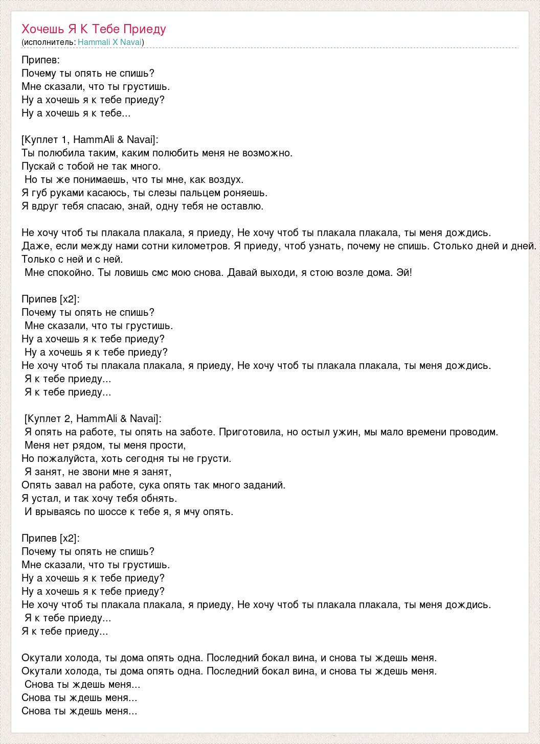 Припев: Почему ты опять не спишь? Мне сказали, что ты грустишь. Ну а хочешь я к тебе приеду? Ну а хочешь я к тебе... [Куплет 1, HammAli & Navai]: Ты полюбила таким, каким полюбить меня не возможно. Пускай с тобой не так много. Но ты же понимаешь, что ты мне, как воздух. Я губ руками касаюсь, ты слезы пальцем роняешь. Я вдруг тебя спасаю, знай, одну тебя не оставлю. Не хочу чтоб ты плакала плакала, я приеду, Не хочу чтоб ты плакала плакала, ты меня дождись. Даже, если между нами сотни километров. Я приеду, чтоб узнать, почему не спишь. Столько дней и дней. Только с ней и с ней. Мне спокойно. Ты ловишь смс мою снова. Давай выходи, я стою возле дома. Эй! Припев [х2]: Почему ты опять не спишь? Мне сказали, что ты грустишь. Ну а хочешь я к тебе приеду? Ну а хочешь я к тебе приеду? Не хочу чтоб ты плакала плакала, я приеду, Не хочу чтоб ты плакала плакала, ты меня дождись. Я к тебе приеду... Я к тебе приеду... [Куплет 2, HammAli & Navai]: Я опять на работе, ты опять на заботе. Приготовила, но остыл ужин, мы мало времени проводим. Меня нет рядом, ты меня прости, Но пожалуйста, хоть сегодня ты не грусти. Я занят, не звони мне я занят, Опять завал на работе, сука опять так много заданий. Я устал, и так хочу тебя обнять. И врываясь по шоссе к тебе я, я мчу опять. Припев [х2]: Почему ты опять не спишь? Мне сказали, что ты грустишь. Ну а хочешь я к тебе приеду? Ну а хочешь я к тебе приеду? Не хочу чтоб ты плакала плакала, я приеду, Не хочу чтоб ты плакала плакала, ты меня дождись. Я к тебе приеду... Я к тебе приеду... Окутали холода, ты дома опять одна. Последний бокал вина, и снова ты ждешь меня. Окутали холода, ты дома опять одна. Последний бокал вина, и снова ты ждешь меня. Снова ты ждешь меня... Снова ты ждешь меня... Снова ты ждешь меня...