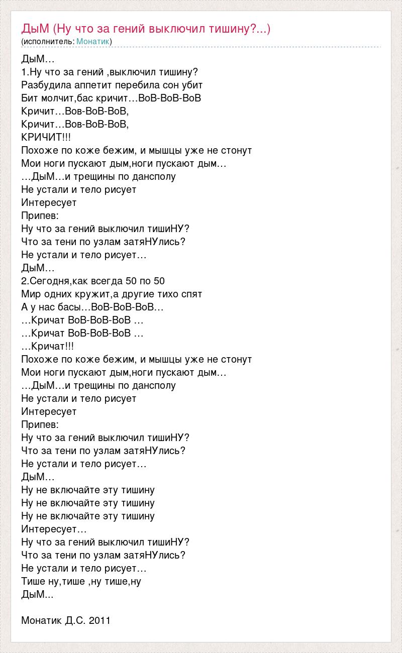 ДыМ… 1.Ну что за гений ,выключил тишину? Разбудила аппетит перебила сон убит Бит молчит,бас кричит…ВоВ-ВоВ-ВоВ Кричит…Вов-ВоВ-ВоВ, Кричит…Вов-ВоВ-ВоВ, КРИЧИТ!!! Похоже по коже бежим, и мышцы уже не стонут Мои ноги пускают дым,ноги пускают дым… …ДыМ…и трещины по дансполу Не устали и тело рисует Интересует Припев: Ну что за гений выключил тишиНУ? Что за тени по узлам затяНУлись? Не устали и тело рисует… ДыМ… 2.Сегодня,как всегда 50 по 50 Мир одних кружит,а другие тихо спят А у нас басы…ВоВ-ВоВ-ВоВ… …Кричат ВоВ-ВоВ-ВоВ … …Кричат ВоВ-ВоВ-ВоВ … …Кричат!!! Похоже по коже бежим, и мышцы уже не стонут Мои ноги пускают дым,ноги пускают дым… …ДыМ…и трещины по дансполу Не устали и тело рисует Интересует Припев: Ну что за гений выключил тишиНУ? Что за тени по узлам затяНУлись? Не устали и тело рисует… ДыМ… Ну не включайте эту тишину Ну не включайте эту тишину Ну не включайте эту тишину Интересует… Ну что за гений выключил тишиНУ? Что за тени по узлам затяНУлись? Не устали и тело рисует… Тише ну,тише ,ну тише,ну ДыМ... Монатик Д.С. 2011