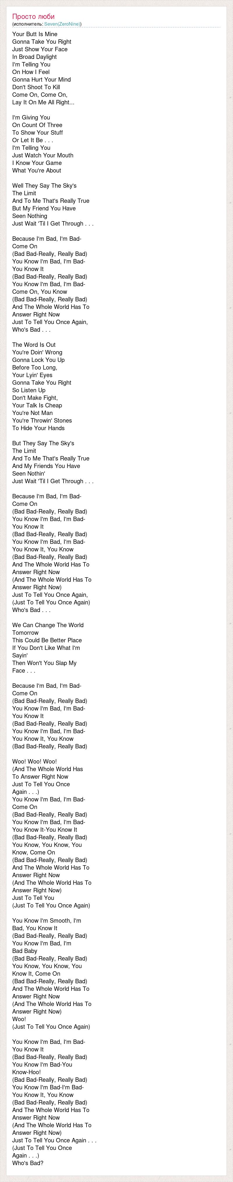Your Butt Is Mine Gonna Take You Right Just Show Your Face In Broad Daylight I'm Telling You On How I Feel Gonna Hurt Your Mind Don't Shoot To Kill Come On, Come On, Lay It On Me All Right... I'm Giving You On Count Of Three To Show Your Stuff Or Let It Be . . . I'm Telling You Just Watch Your Mouth I Know Your Game What You're About Well They Say The Sky's The Limit And To Me That's Really True But My Friend You Have Seen Nothing Just Wait 'Til I Get Through . . . Because I'm Bad, I'm Bad- Come On (Bad Bad-Really, Really Bad) You Know I'm Bad, I'm Bad- You Know It (Bad Bad-Really, Really Bad) You Know I'm Bad, I'm Bad- Come On, You Know (Bad Bad-Really, Really Bad) And The Whole World Has To Answer Right Now Just To Tell You Once Again, Who's Bad . . . The Word Is Out You're Doin' Wrong Gonna Lock You Up Before Too Long, Your Lyin' Eyes Gonna Take You Right So Listen Up Don't Make Fight, Your Talk Is Cheap You're Not Man You're Throwin' Stones To Hide Your Hands But They Say The Sky's The Limit And To Me That's Really True And My Friends You Have Seen Nothin' Just Wait 'Til I Get Through . . . Because I'm Bad, I'm Bad- Come On (Bad Bad-Really, Really Bad) You Know I'm Bad, I'm Bad- You Know It (Bad Bad-Really, Really Bad) You Know I'm Bad, I'm Bad- You Know It, You Know (Bad Bad-Really, Really Bad) And The Whole World Has To Answer Right Now (And The Whole World Has To Answer Right Now) Just To Tell You Once Again, (Just To Tell You Once Again) Who's Bad . . . We Can Change The World Tomorrow This Could Be Better Place If You Don't Like What I'm Sayin' Then Won't You Slap My Face . . . Because I'm Bad, I'm Bad- Come On (Bad Bad-Really, Really Bad) You Know I'm Bad, I'm Bad- You Know It (Bad Bad-Really, Really Bad) You Know I'm Bad, I'm Bad- You Know It, You Know (Bad Bad-Really, Really Bad) Woo! Woo! Woo! (And The Whole World Has To Answer Right Now Just To Tell You Once Again . . .) You Know I'm Bad, I'm Bad- Come On (Bad Bad-Really, Really Bad) You Know I'm Bad, I'm Bad- You Know It-You Know It (Bad Bad-Really, Really Bad) You Know, You Know, You Know, Come On (Bad Bad-Really, Really Bad) And The Whole World Has To Answer Right Now (And The Whole World Has To Answer Right Now) Just To Tell You (Just To Tell You Once Again) You Know I'm Smooth, I'm Bad, You Know It (Bad Bad-Really, Really Bad) You Know I'm Bad, I'm Bad Baby (Bad Bad-Really, Really Bad) You Know, You Know, You Know It, Come On (Bad Bad-Really, Really Bad) And The Whole World Has To Answer Right Now (And The Whole World Has To Answer Right Now) Woo! (Just To Tell You Once Again) You Know I'm Bad, I'm Bad- You Know It (Bad Bad-Really, Really Bad) You Know I'm Bad-You Know-Hoo! (Bad Bad-Really, Really Bad) You Know I'm Bad-I'm Bad- You Know It, You Know (Bad Bad-Really, Really Bad) And The Whole World Has To Answer Right Now (And The Whole World Has To Answer Right Now) Just To Tell You Once Again . . . (Just To Tell You Once Again . . .) Who's Bad?