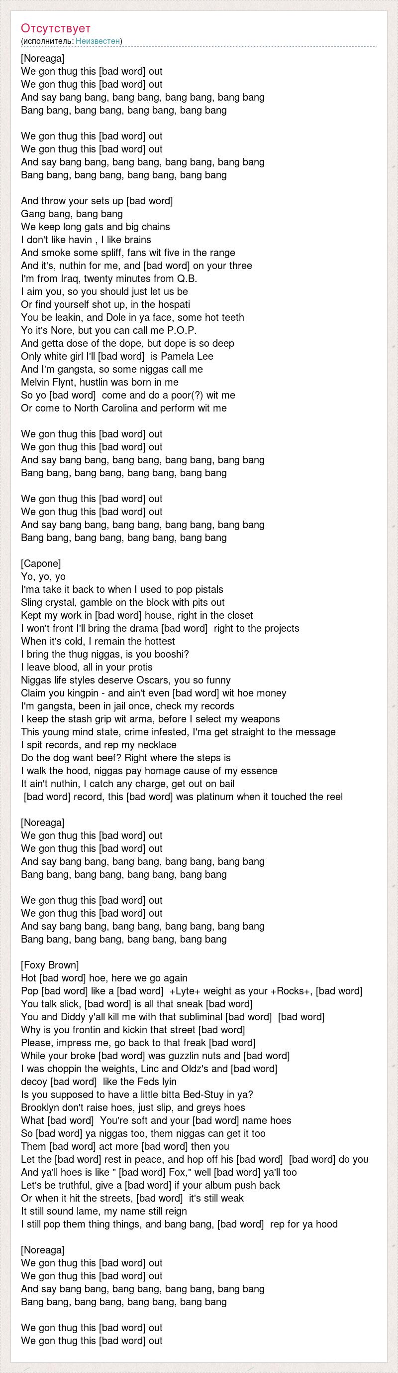 [Noreaga] We gon thug this [bad word] out We gon thug this [bad word] out And say bang bang, bang bang, bang bang, bang bang Bang bang, bang bang, bang bang, bang bang We gon thug this [bad word] out We gon thug this [bad word] out And say bang bang, bang bang, bang bang, bang bang Bang bang, bang bang, bang bang, bang bang And throw your sets up [bad word] Gang bang, bang bang We keep long gats and big chains I don't like havin , I like brains And smoke some spliff, fans wit five in the range And it's, nuthin for me, and [bad word] on your three I'm from Iraq, twenty minutes from Q.B. I aim you, so you should just let us be Or find yourself shot up, in the hospati You be leakin, and Dole in ya face, some hot teeth Yo it's Nore, but you can call me P.O.P. And getta dose of the dope, but dope is so deep Only white girl I'll [bad word] is Pamela Lee And I'm gangsta, so some niggas call me Melvin Flynt, hustlin was born in me So yo [bad word] come and do a poor(?) wit me Or come to North Carolina and perform wit me We gon thug this [bad word] out We gon thug this [bad word] out And say bang bang, bang bang, bang bang, bang bang Bang bang, bang bang, bang bang, bang bang We gon thug this [bad word] out We gon thug this [bad word] out And say bang bang, bang bang, bang bang, bang bang Bang bang, bang bang, bang bang, bang bang [Capone] Yo, yo, yo I'ma take it back to when I used to pop pistals Sling crystal, gamble on the block with pits out Kept my work in [bad word] house, right in the closet I won't front I'll bring the drama [bad word] right to the projects When it's cold, I remain the hottest I bring the thug niggas, is you booshi? I leave blood, all in your protis Niggas life styles deserve Oscars, you so funny Claim you kingpin - and ain't even [bad word] wit hoe money I'm gangsta, been in jail once, check my records I keep the stash grip wit arma, before I select my weapons This young mind state, crime infested, I'ma get straight to the message I spit records, and rep my necklace Do the dog want beef? Right where the steps is I walk the hood, niggas pay homage cause of my essence It ain't nuthin, I catch any charge, get out on bail [bad word] record, this [bad word] was platinum when it touched the reel [Noreaga] We gon thug this [bad word] out We gon thug this [bad word] out And say bang bang, bang bang, bang bang, bang bang Bang bang, bang bang, bang bang, bang bang We gon thug this [bad word] out We gon thug this [bad word] out And say bang bang, bang bang, bang bang, bang bang Bang bang, bang bang, bang bang, bang bang [Foxy Brown] Hot [bad word] hoe, here we go again Pop [bad word] like a [bad word] +Lyte+ weight as your +Rocks+, [bad word] You talk slick, [bad word] is all that sneak [bad word] You and Diddy y'all kill me with that subliminal [bad word] [bad word] Why is you frontin and kickin that street [bad word] Please, impress me, go back to that freak [bad word] While your broke [bad word] was guzzlin nuts and [bad word] I was choppin the weights, Linc and Oldz's and [bad word] decoy [bad word] like the Feds lyin Is you supposed to have a little bitta Bed-Stuy in ya? Brooklyn don't raise hoes, just slip, and greys hoes What [bad word] You're soft and your [bad word] name hoes So [bad word] ya niggas too, them niggas can get it too Them [bad word] act more [bad word] then you Let the [bad word] rest in peace, and hop off his [bad word] [bad word] do you And ya'll hoes is like " [bad word] Fox," well [bad word] ya'll too Let's be truthful, give a [bad word] if your album push back Or when it hit the streets, [bad word] it's still weak It still sound lame, my name still reign I still pop them thing things, and bang bang, [bad word] rep for ya hood [Noreaga] We gon thug this [bad word] out We gon thug this [bad word] out And say bang bang, bang bang, bang bang, bang bang Bang bang, bang bang, bang bang, bang bang We gon thug this [bad word] out We gon thug this [bad word] out