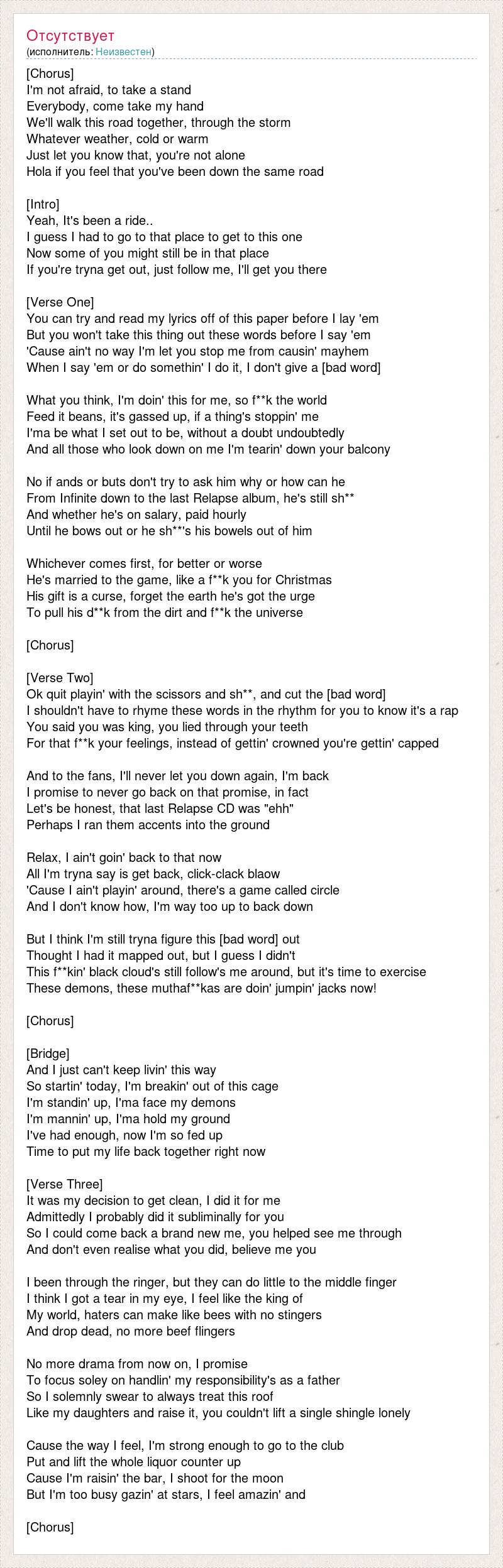 [Chorus] I'm not afraid, to take a stand Everybody, come take my hand We'll walk this road together, through the storm Whatever weather, cold or warm Just let you know that, you're not alone Hola if you feel that you've been down the same road [Intro] Yeah, It's been a ride.. I guess I had to go to that place to get to this one Now some of you might still be in that place If you're tryna get out, just follow me, I'll get you there [Verse One] You can try and read my lyrics off of this paper before I lay 'em But you won't take this thing out these words before I say 'em 'Cause ain't no way I'm let you stop me from causin' mayhem When I say 'em or do somethin' I do it, I don't give a [bad word] What you think, I'm doin' this for me, so f**k the world Feed it beans, it's gassed up, if a thing's stoppin' me I'ma be what I set out to be, without a doubt undoubtedly And all those who look down on me I'm tearin' down your balcony No if ands or buts don't try to ask him why or how can he From Infinite down to the last Relapse album, he's still sh** And whether he's on salary, paid hourly Until he bows out or he sh**'s his bowels out of him Whichever comes first, for better or worse He's married to the game, like a f**k you for Christmas His gift is a curse, forget the earth he's got the urge To pull his d**k from the dirt and f**k the universe [Chorus] [Verse Two] Ok quit playin' with the scissors and sh**, and cut the [bad word] I shouldn't have to rhyme these words in the rhythm for you to know it's a rap You said you was king, you lied through your teeth For that f**k your feelings, instead of gettin' crowned you're gettin' capped And to the fans, I'll never let you down again, I'm back I promise to never go back on that promise, in fact Let's be honest, that last Relapse CD was "ehh" Perhaps I ran them accents into the ground Relax, I ain't goin' back to that now All I'm tryna say is get back, click-clack blaow 'Cause I ain't playin' around, there's a game called circle And I don't know how, I'm way too up to back down But I think I'm still tryna figure this [bad word] out Thought I had it mapped out, but I guess I didn't This f**kin' black cloud's still follow's me around, but it's time to exercise These demons, these muthaf**kas are doin' jumpin' jacks now! [Chorus] [Bridge] And I just can't keep livin' this way So startin' today, I'm breakin' out of this cage I'm standin' up, I'ma face my demons I'm mannin' up, I'ma hold my ground I've had enough, now I'm so fed up Time to put my life back together right now [Verse Three] It was my decision to get clean, I did it for me Admittedly I probably did it subliminally for you So I could come back a brand new me, you helped see me through And don't even realise what you did, believe me you I been through the ringer, but they can do little to the middle finger I think I got a tear in my eye, I feel like the king of My world, haters can make like bees with no stingers And drop dead, no more beef flingers No more drama from now on, I promise To focus soley on handlin' my responsibility's as a father So I solemnly swear to always treat this roof Like my daughters and raise it, you couldn't lift a single shingle lonely Cause the way I feel, I'm strong enough to go to the club Put and lift the whole liquor counter up Cause I'm raisin' the bar, I shoot for the moon But I'm too busy gazin' at stars, I feel amazin' and [Chorus]